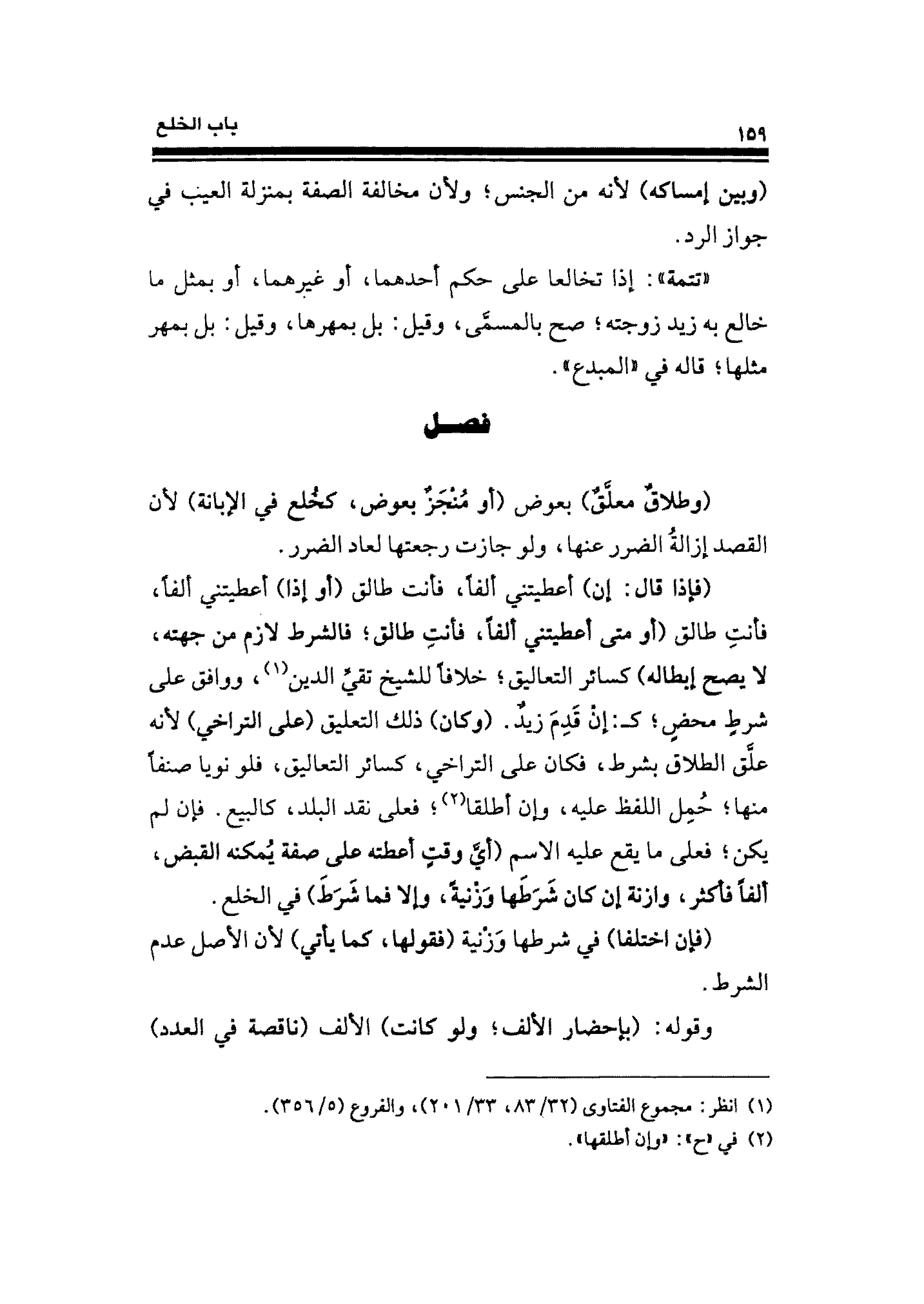 (فإذا قال: إن) أعطيتني ألفًا، فأنت طالق (أو إذا) أعطيتني ألفًا، فأنتِ طالق (أو متى أعطيتني ألفًا، فأنتِ طالق؛ فالشرط لازم من جهته، لا يصح إبطاله) كسائر التعاليق؛ خلافًا للشيخ تقيِّ الدين (¬١)، ووافق على شرطٍ محضٍ؛ كـ: إن قَدِمَ زيدٌ. (وكان) ذلك التعليق (على التراخي) لأنه علَّق الطلاق بشرط، فكان على التراخي، كسائر التعاليق، فلو نويا صنفًا منها؛ حُمِل اللفظ عليه، وإن أطلقا (¬٢)؛ فعلى نقد البلد، كالبيع. فإن لم يكن؛ فعلى ما يقع عليه الاسم (أيَّ وقتٍ أعطته على صفة يُمكنه القبض، ألفًا فأكثر، وازنة إن كان شَرَطَها وَزنيةً، وإلا فما شرَطَ) في الخلع.