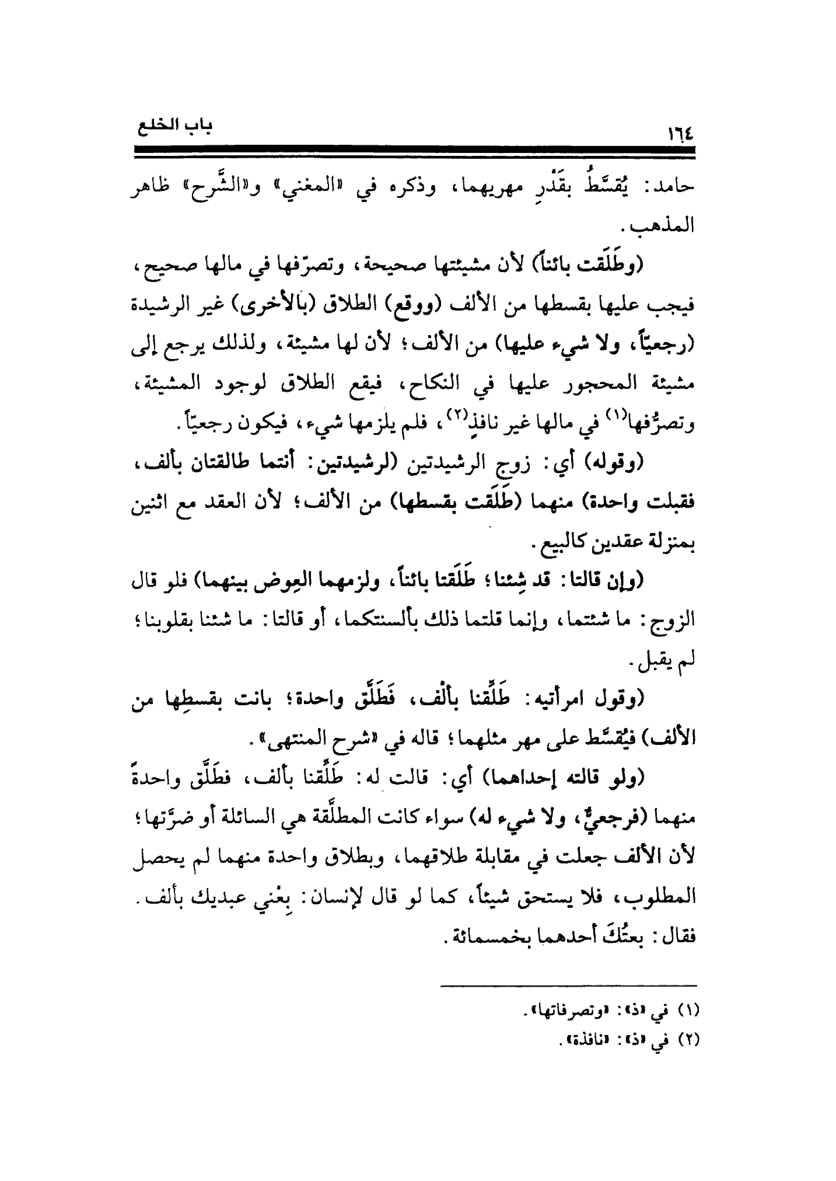 (وطَلَقت بائنًا) لأن مشيئتها صحيحة، وتصرّفها في مالها صحيح، فيجب عليها بقسطها من الألف (ووقع) الطلاق (بالأخرى) غير الرشيدة (رجعيًّا، ولا شيء عليها) من الألف؛ لأن لها مشيئة، ولذلك يرجع إلى مشيئة المحجور عليها في النكاح، فيقع الطلاق لوجود المشيئة، وتصرُّفها (¬١) في مالها غير نافذٍ (¬٢)، فلم يلزمها شيء، فيكون رجعيًّا.