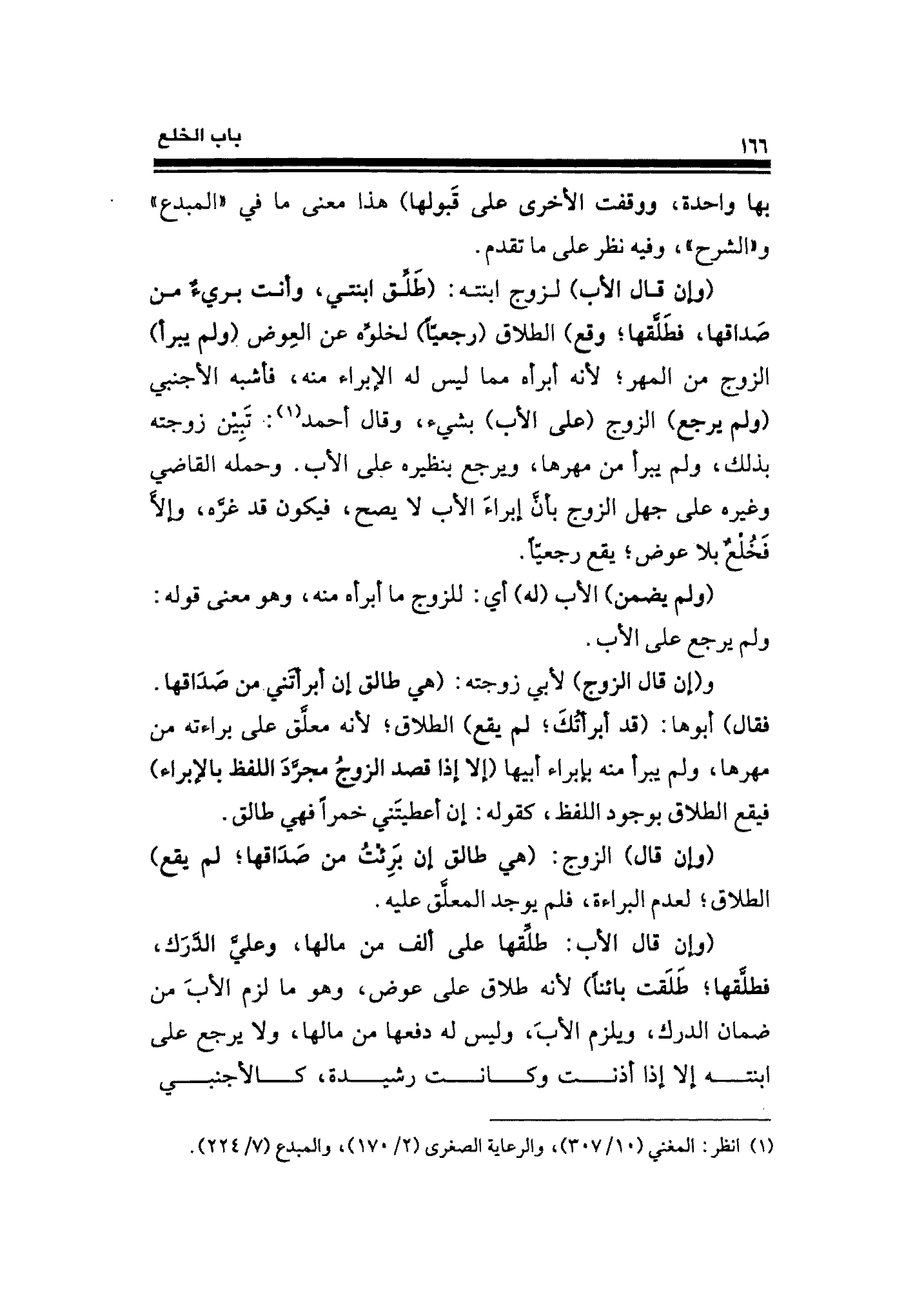 (وإن قال الأب) لزوج ابنته: (طَلِّق ابنتي، وأنت بريءٌ من صَداقها، فطَلَّقها؛ وقع) الطلاق (رجعيًّا) لخلوِّه عن العِوض (ولم يبرأ) الزوج من المهر؛ لأنَّه أبرأه مما ليس له الإبراء منه، فأشبه الأجنبي (ولم يرجع) الزوج (على الأب) بشيء، وقال أحمد (¬١): تَبِين زوجته بذلك، ولم يبرأ من مهرها، ويرجع بنظيره على الأب. وحمله القاضي وغيره على جهل الزوج بأنَّ إبراءَ الأب لا يصح، فيكون قد غَرَّه، وإلَّا فَخُلْعٌ بلا عوض؛ يقع رجعيًّا.