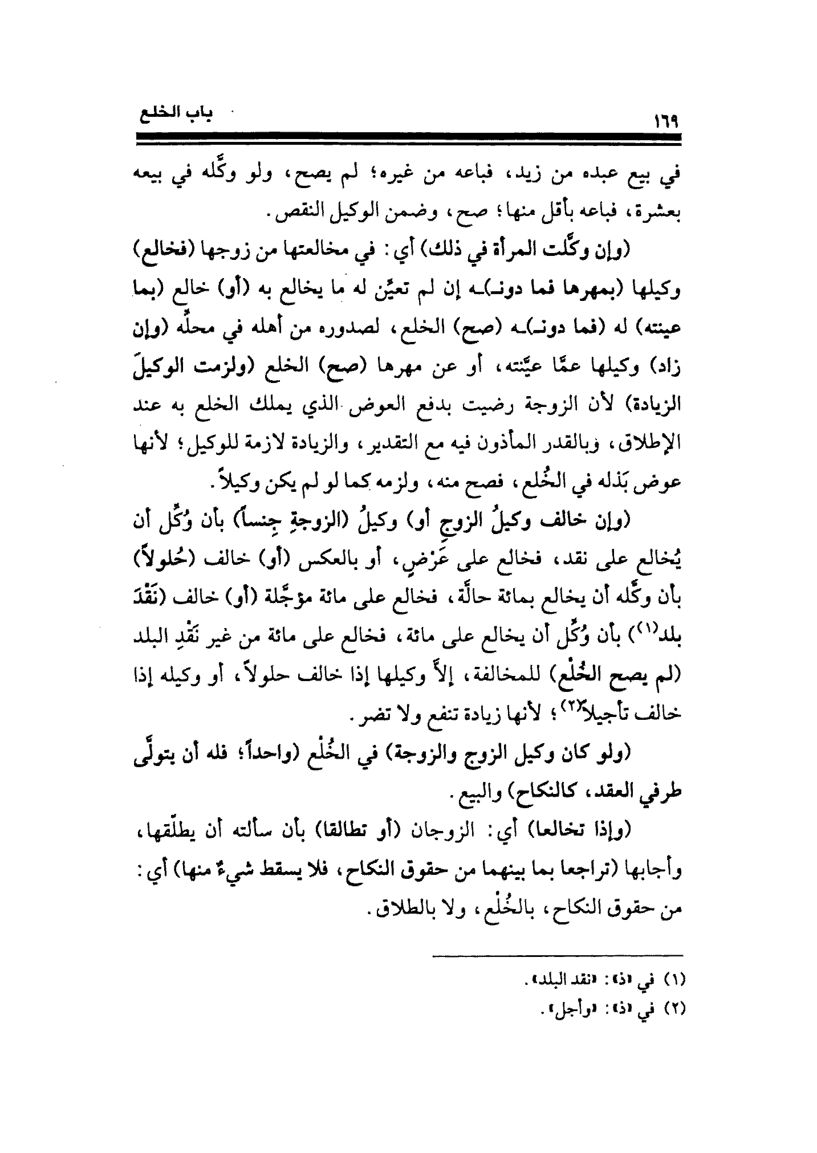 (وإن خالف وكيلُ الزوجِ أو) وكيلُ (الزوجةِ جِنسًا) بأن وُكِّل أن يُخالع على نقد، فخالع على عَرْضٍ، أو بالعكس (أو) خالف (حُلولًا) بأن وكَّله أن يخالع بمائة حالَّة، فخالع على مائة مؤجَّلة (أو) خالف (نَقدَ بلد (¬١)) بأن وُكِّل أن يخالع على مائة، فخالع على مائة من غير نَقْدِ البلد (لم يصح الخلع) للمخالفة، إلّا وكيلها إذا خالف حلولًا، أو وكيله إذا خالف تأجيلًا (¬٢)؛ لأنها زيادة تنفع ولا تضر.