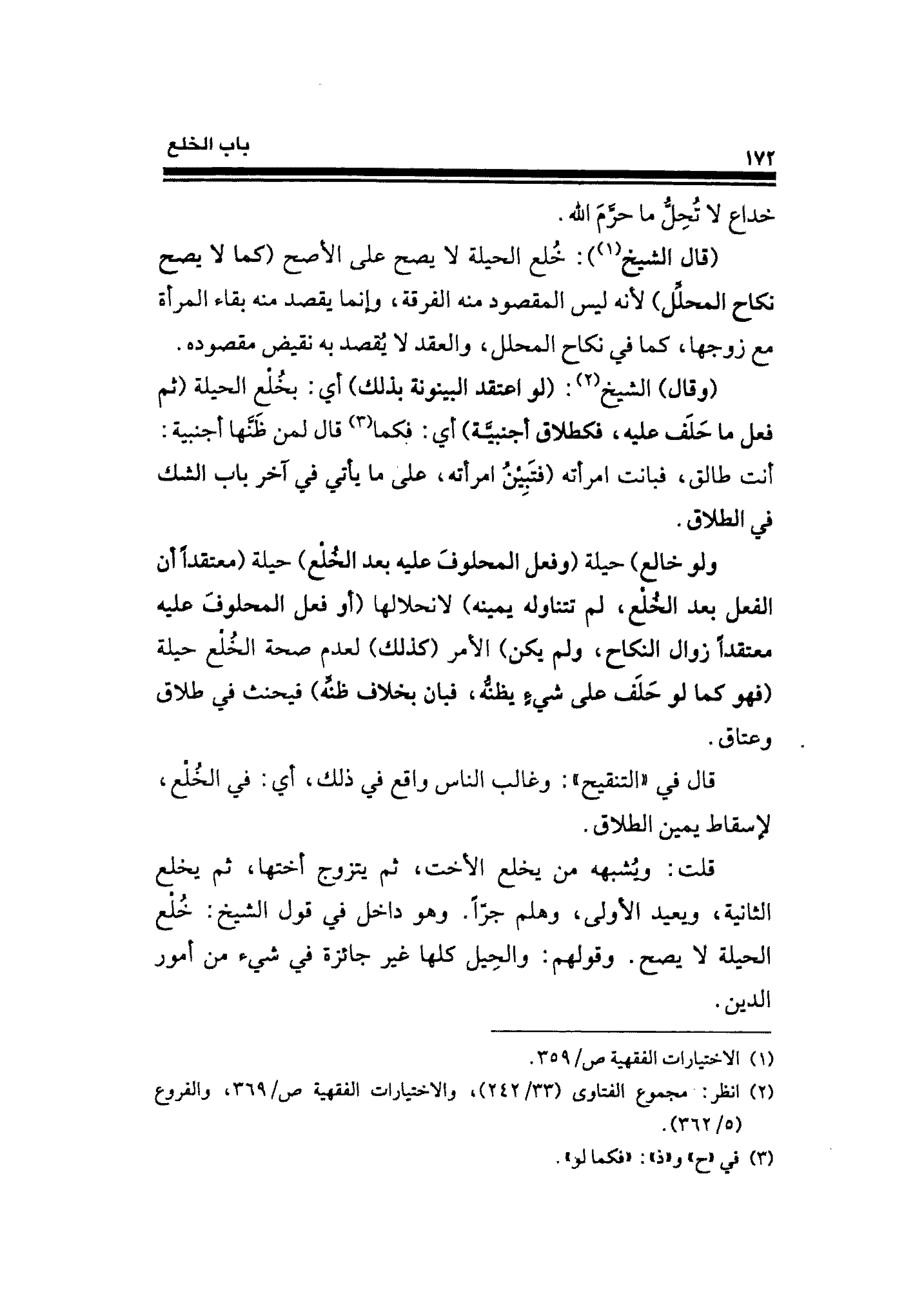 قال في "التنقيح": وغالب الناس واقع في ذلك، أي: في الخُلْع، لإسقاط يمين الطلاق.