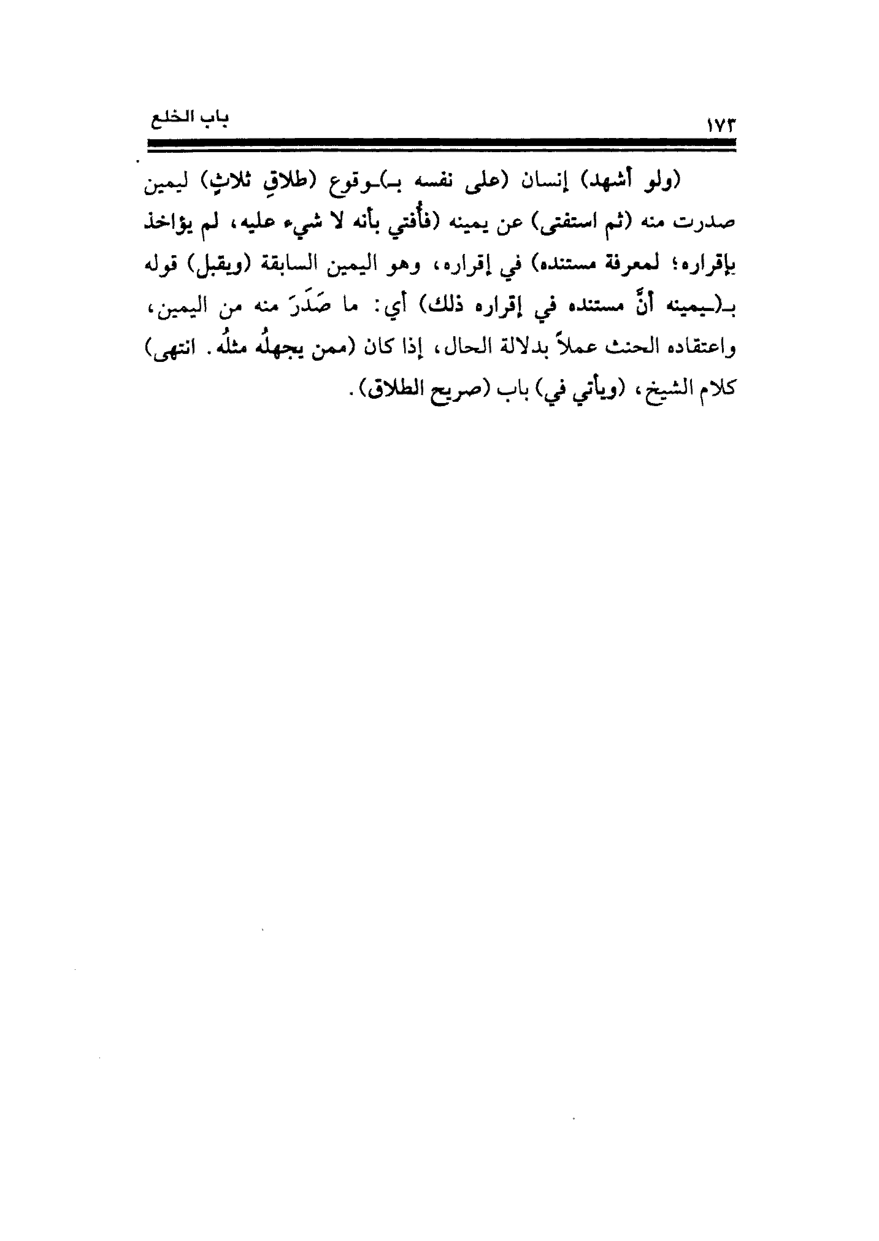 (ولو أشهد) إنسان (على نفسه بـ) ـوقوع (طلاقِ ثلاثٍ) ليمين صدرت منه (ثم استفتى) عن يمينه (فأُفتي بأنه لا شيء عليه، لم يؤاخذ بإقراره؛ لمعرفة مستنده) في إقراره، وهو اليمين السابقة (ويقبل) قوله بـ (ـيمينه أن مستنده في إقراره ذلك) أي: ما صَدَرَ منه من اليمين، واعتقاده الحنث عملًا بدلالة الحال، إذا كان (ممن يجهلُه مثله. انتهى) كلام الشيخ، (ويأتي في) باب (صريح الطلاق).
