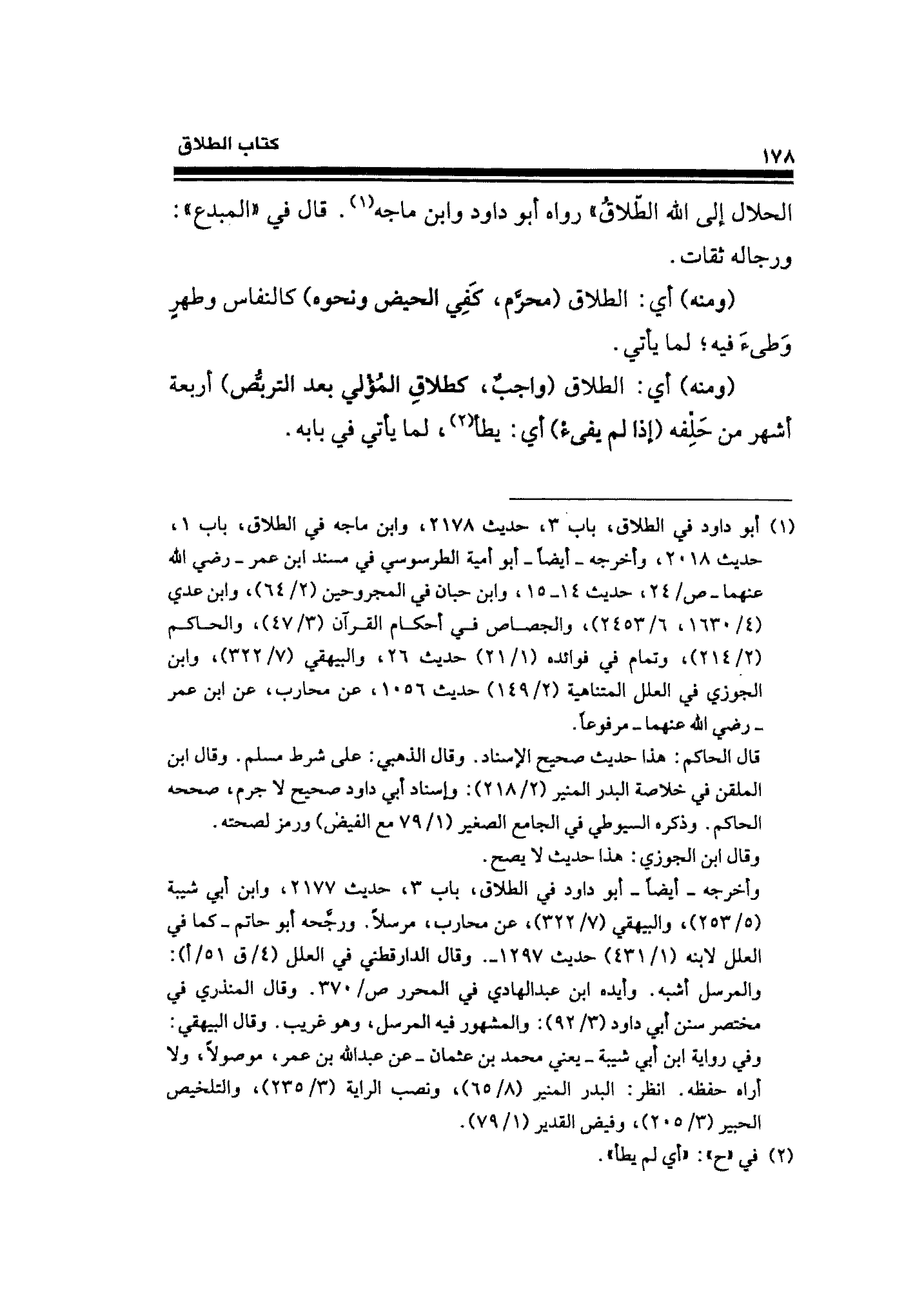 (¬١) أبو داود في الطلاق، باب ٣، حديث ٢١٧٨، وابن ماجه في الطلاق، باب ١، حديث ٢٠١٨، وأخرجه -أيضًا- أبو أمية الطرسوسي في مسند ابن عمر - رضي الله عنهما - ص / ٢٤، حديث ١٤ - ١٥، وابن حبان في المجروحين (٢/ ٦٤)، وابن عدي (٤/ ١٦٣٠، ٦/ ٢٤٥٣)، والجصاص في أحكام القرآن (٣/ ٤٧)، والحاكم (٢/ ٢١٤)، وتمام في فوائده (١/ ٢١) حديث ٢٦، والبيهقي (٧/ ٣٢٢)، وابن الجوزي في العلل المتناهية (٢/ ١٤٩) حديث ١٠٥٦، عن محارب، عن ابن عمر - رضي الله عنهما - مرفوعًا.