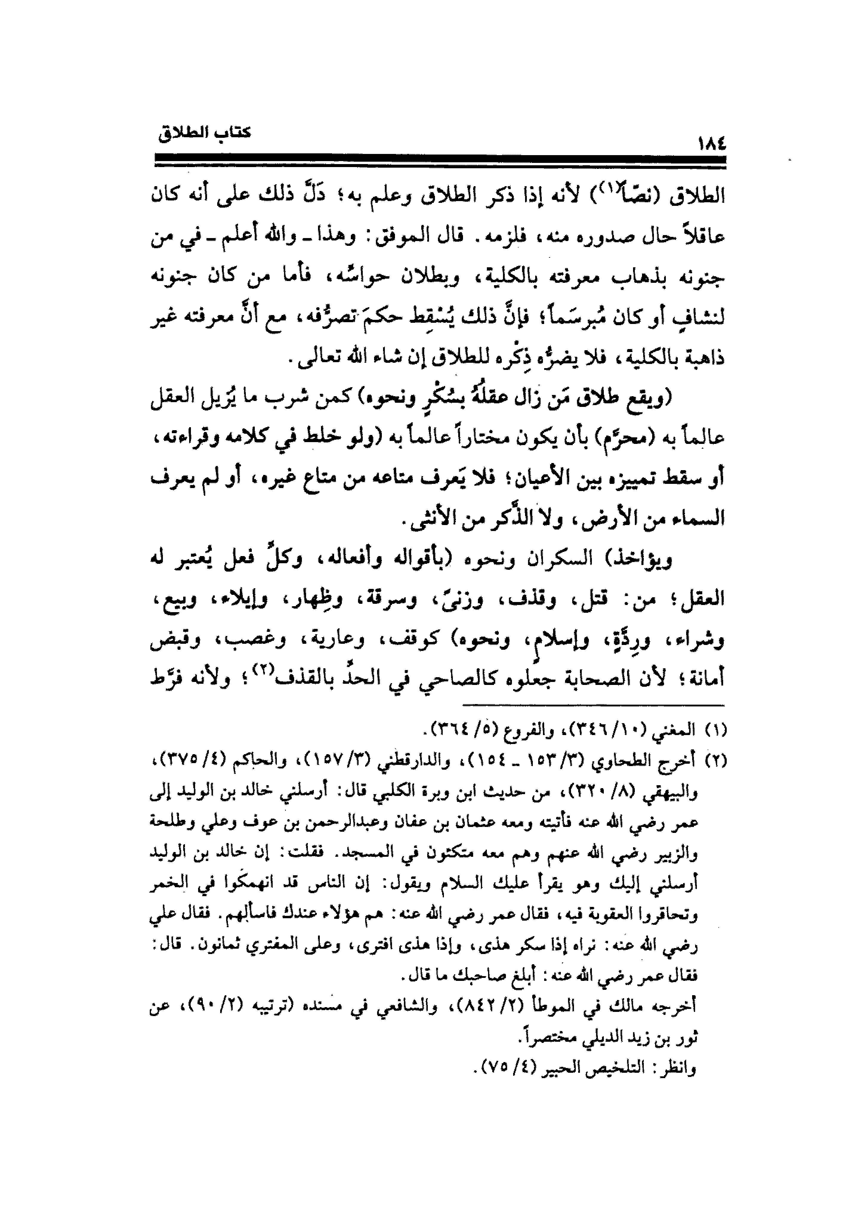 (¬٢) أخرج الطحاوي (٣/ ١٥٣ - ١٥٤)، والدارقطني (٣/ ١٥٧)، والحاكم (٤/ ٣٧٥)، والبيهقي (٨/ ٣٢٠)، من حديث ابن وبرة الكلبي قال: أرسلني خالد بن الوليد إلى عمر - رضي الله عنه - فأتيته ومعه عثمان بن عفان وعبد الرحمن بن عوف وعلي وطلحة والزبير - رضي الله عنهم - وهم معه متكئون في المسجد. فقلت: إن خالد بن الوليد أرسلني إليك وهو يقرأ عليك السلام ويقول: إن الناس قد أنهمكوا في الخمر وتحاقروا العقوبة فيه، فقال عمر - رضي الله عنه -: هم هولاء عندك فاسألهم. فقال علي - رضي الله عنه -: نراه إذا سكر هذى، وإذا هذى افترى، وعلى المفتري ثمانون. قال: فقال عمر - رضي الله عنه -: أبلغ صاحبك ما قال.