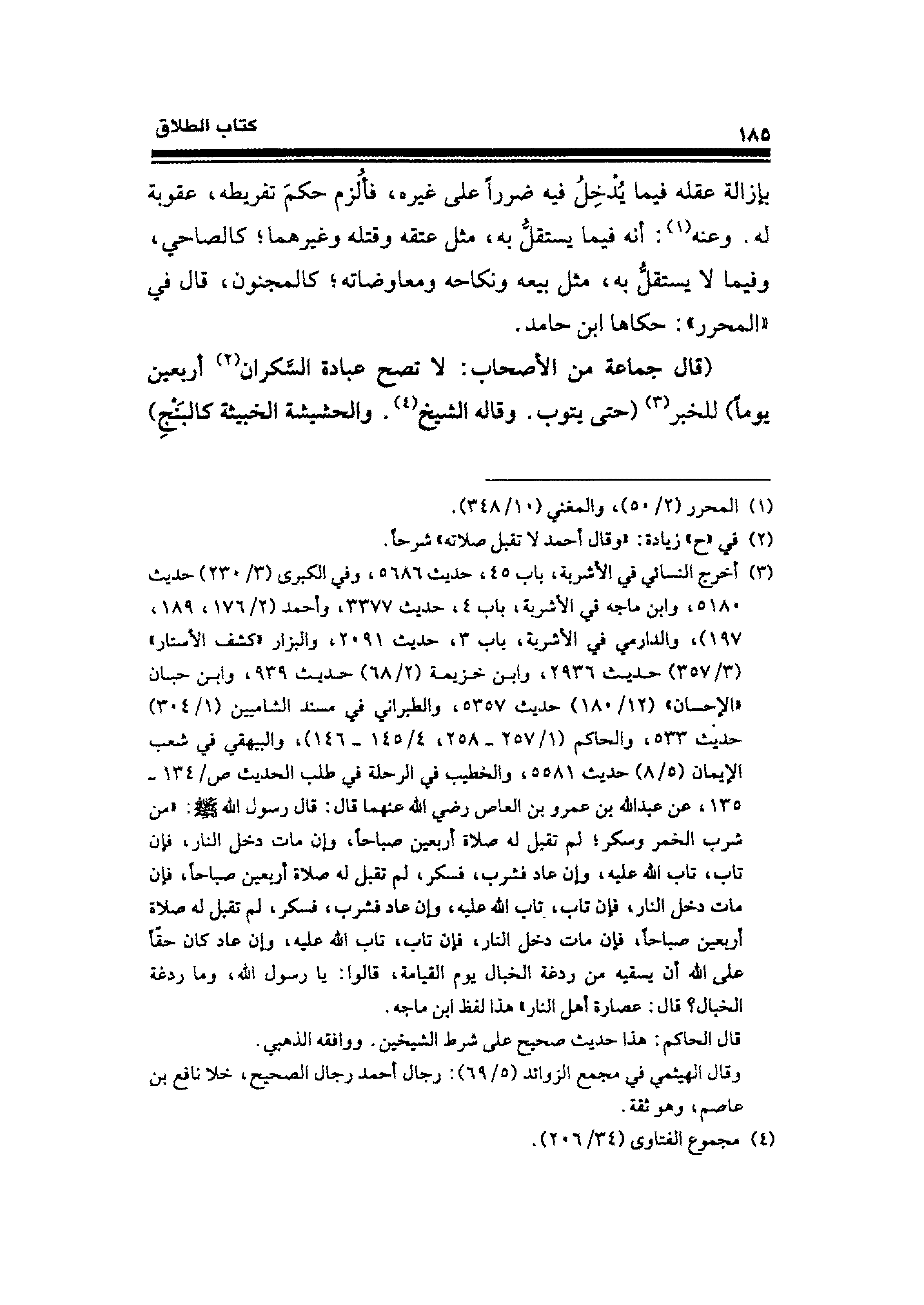 (¬٣) أخرج النسائي في الأشربة، باب ٤٥، حديث ٥٦٨٦، وفي الكبرى (٣/ ٢٣٠) حديث ٥١٨٠، وابن ماجه في الأشربة، باب ٤، حديث ٣٣٧٧، وأحمد (٢/ ١٧٦، ١٨٩، ١٩٧)، والدارمي في الأشربة، باب ٣، حديث ٢٠٩١، والبزار "كشف الأستار" (٣/ ٣٥٧) حديث ٢٩٣٦، وابن خزيمة (٢/ ٦٨) حدكث ٩٣٩، وابن حبان "الإحسان" (١٢/ ١٨٠) حديث ٥٣٥٧، والطبراني في مسند الشاميين (١/ ٣٠٤) حديث ٥٣٣، والحاكم (١/ ٢٥٧ - ٢٥٨، ٤/ ١٤٥ - ١٤٦)، والبيهقي في شعب الإيمان (٥/ ٨) حديث ٥٥٨١، والخطيب في الرحلة في طلب الحديث ص / ١٣٤ - ١٣٥، عن عبد الله بن عمرو بن العاص - رضي الله عنهما - قال: قال رسول الله - صلى الله عليه وسلم -: "من شرب الخمر وسكر؛ لم تقبل له صلاة أربعين صباحًا، وإن مات دخل النار، فإن تاب، تاب الله عليه، وإن عاد فشرب، فسكر، لم تقبل له صلاة أربعين صباحًا، فإن مات دخل النار، فإن تاب، تاب الله عليه، وإن عاد فشرب، فسكر، لم تقبل له صلاة أربعين صباحًا، فإن مات دخل النار، فإن تاب، تاب الله عليه، وإن عاد كان حقًّا على الله أن يسقيه من ردغة الخبال يوم القيامة، قالوا: يا رسول الله، وما ردغة الخبال؟ قال: عصارة أهل النار" هذا لفظ ابن ماجه.