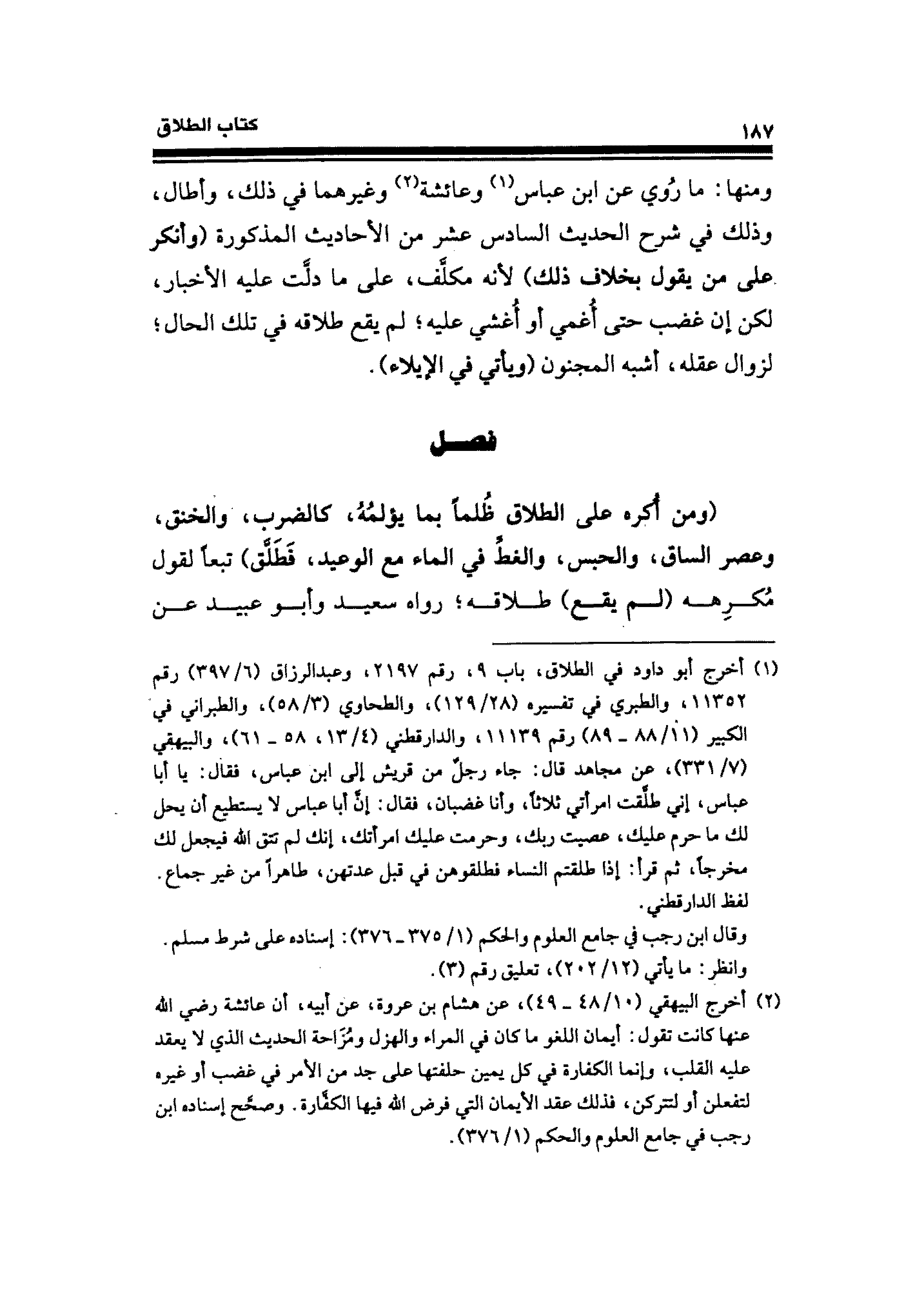ومنها: ما رُوي عن ابن عباس (¬١) وعائشة (¬٢) وغيرهما في ذلك، وأطال، وذلك في شرح الحديث السادس عشر من الأحاديث المذكورة (وأنكر على من يقول بخلاف ذلك) لأنه مكلَّف، على ما دلَّت عليه الأخبار، لكن إن غضب حتى أُغمي أو أُغشي عليه؛ لم يقع طلاقه في تلك الحال؛ لزوال عقله، أشبه المجنون (ويأتي في الإيلاء).
