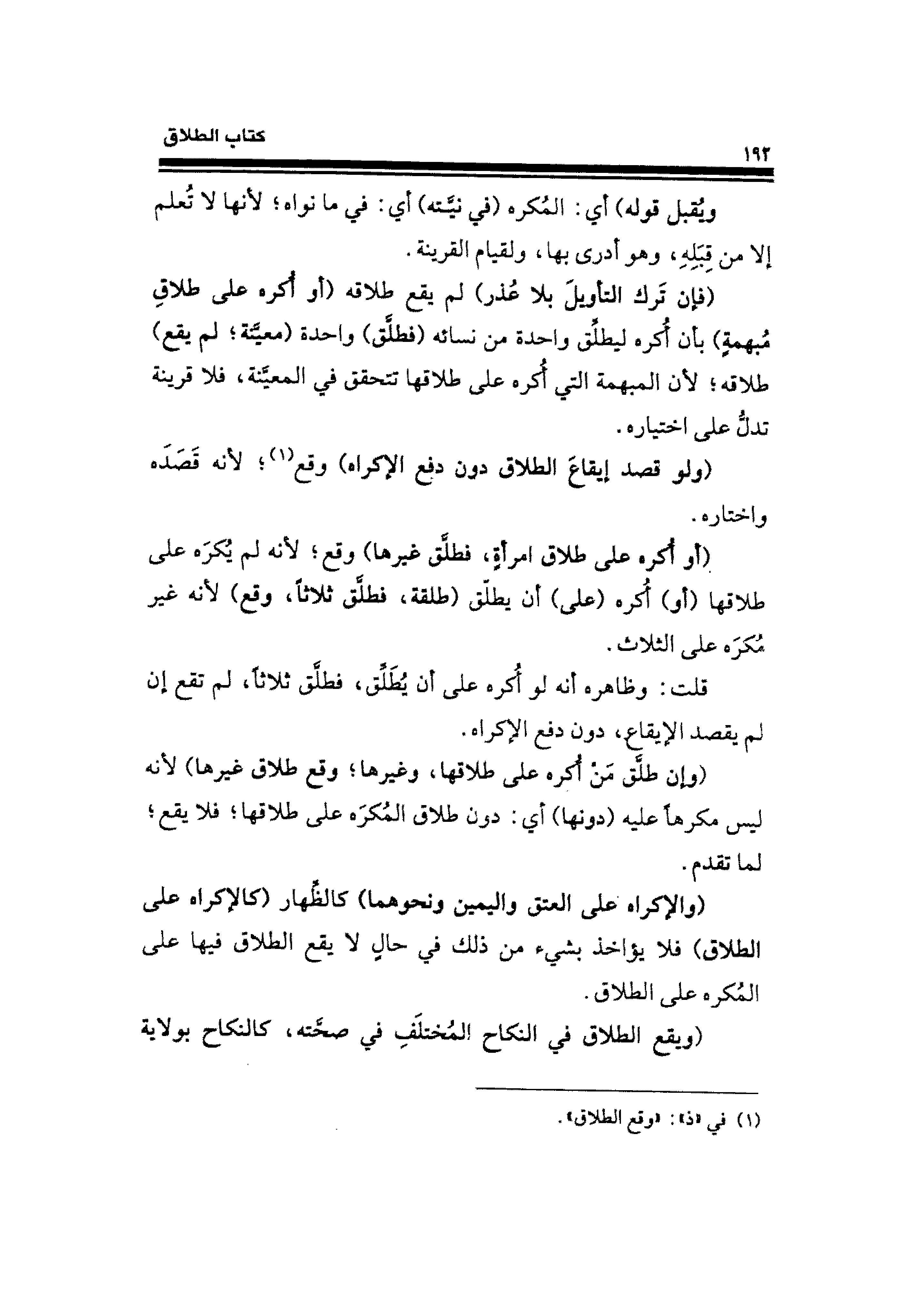 قلت: وظاهره أنَّه لو أُكره على أن يُطْلِّق، فطلق ثلاثًا، لم تقع إن لم يقصد الإيقاع، دون دفع الإكراه.