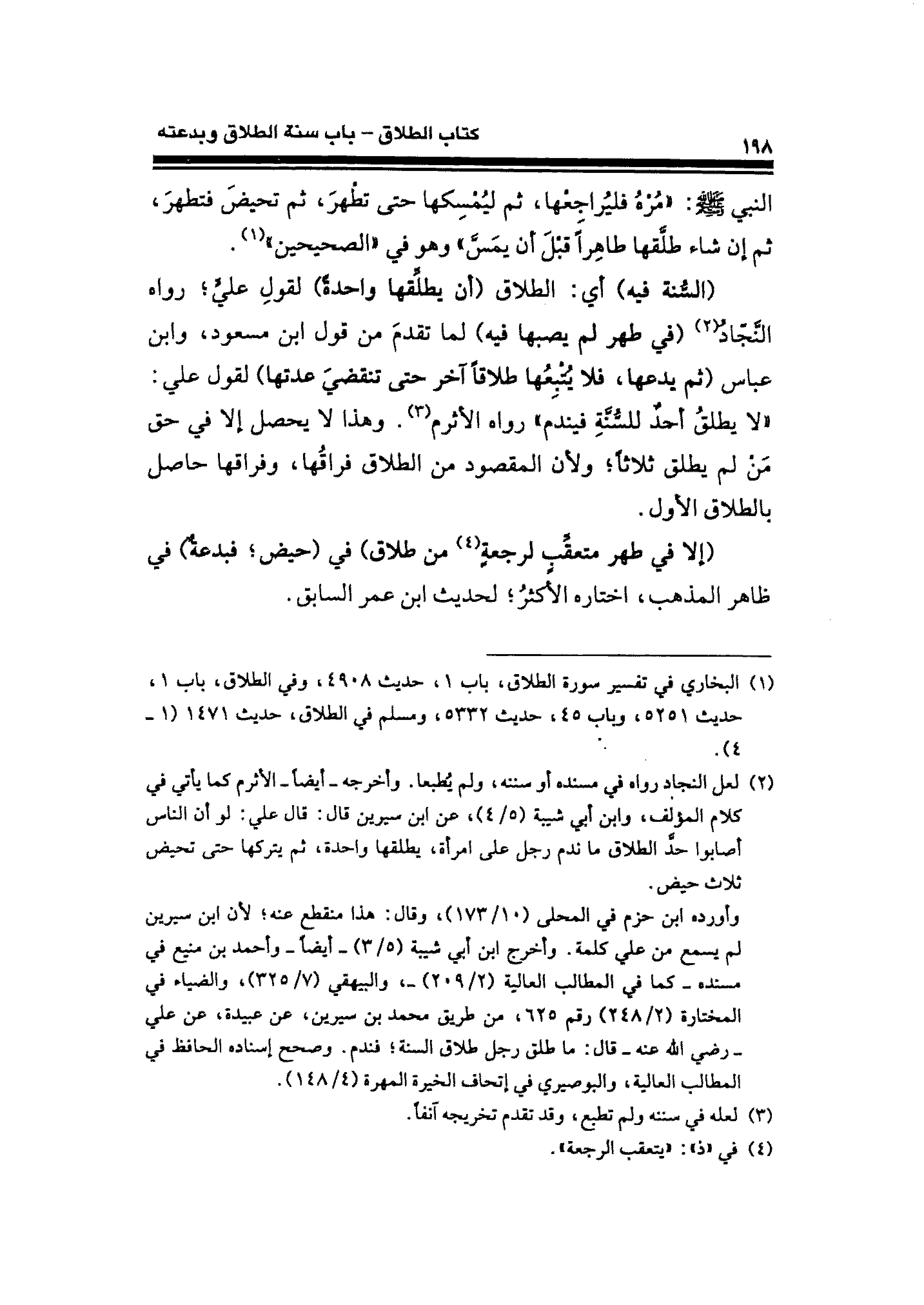 (¬٢) لعل النجاد رواه في مسنده أو سننه، ولم يُطبعا. وأخرجه -أيضًا- الأثرم كما يأتي في كلام المؤلف، وابن أبي شيبة (٥/ ٤)، عن ابن سيرين قال: قال علي: لو أن الناس أصابوا حدَّ الطلاق ما ندم رجل على امرأة، يطلقها واحدة، ثم يتركها حتى تحيض نلاث حيض.