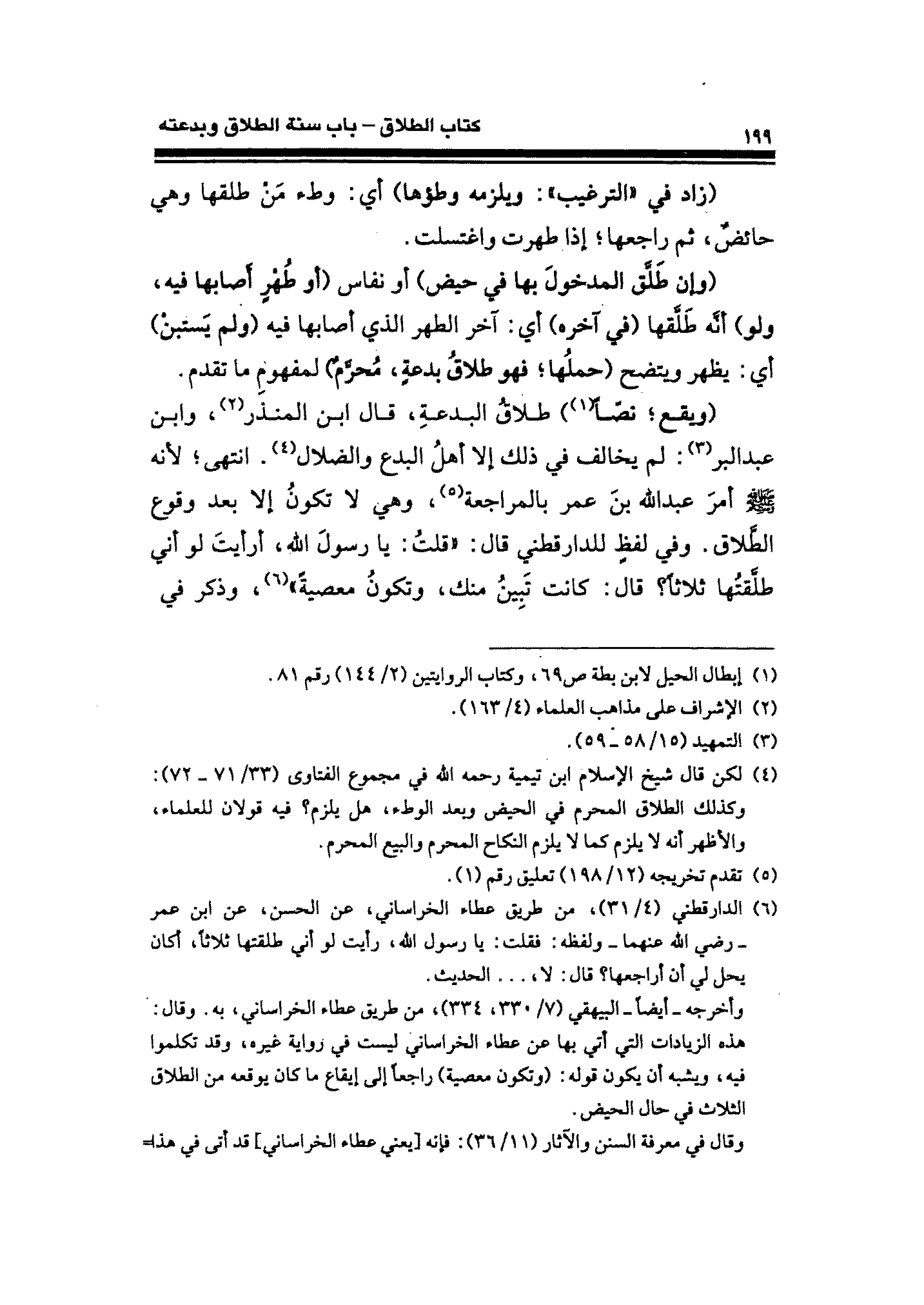 (¬٤) لكن قال شيخ الإسلام ابن تيمية رحمه الله في مجموع الفتاوى (٣٣/ ٧١ - ٧٢): وكذلك الطلاق المحرم في الحيض وبعد الوطء، هل يلزم؟ فيه قولان للعلماء، والأظهر أنه لا يلزم كما لا يلزم النكاح المحرم والبيع المحرم.