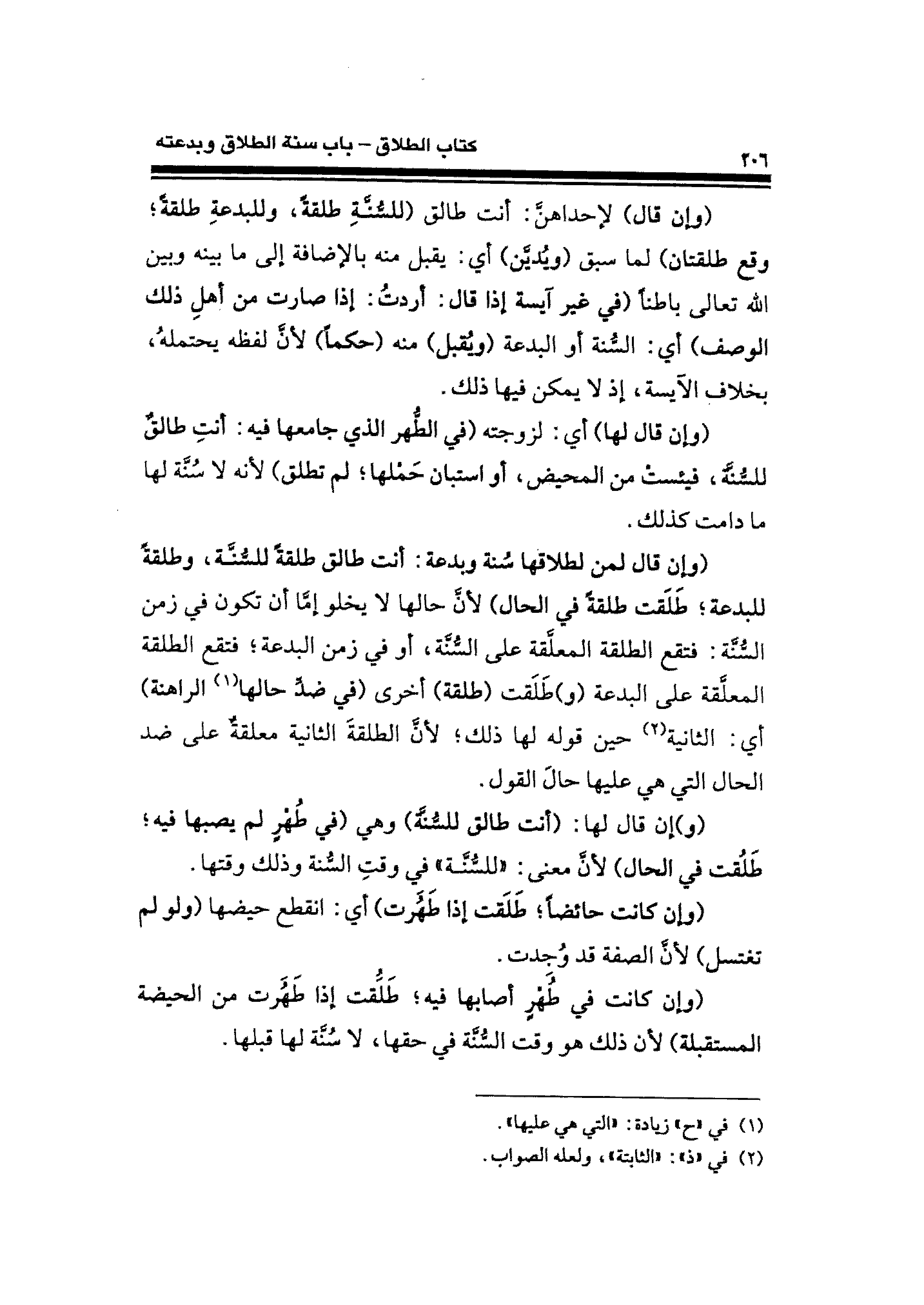 (وإن قال لمن لطلاقها سُنة وبدعة: أنت طالق طلقةً للسُّنَّة، وطلقةً للبدعة؛ طَلَقت طلقةً في الحال) لأنَّ حالها لا يخلو إمَّا أن تكون في زمن السُّنَّة: فتقع الطلقة المعلَّقة على السُّنَّة، أو في زمن البدعة؛ فتقع الطلقة المعلَّقة على البدعة (و) طَلَقت (طلقة) أخرى (في ضدِّ حالها (¬١) الراهنة) أي: الثانية (¬٢) حين قوله لها ذلك؛ لأنَّ الطلقةَ الثانية معلقةٌ على ضد الحال التي هي عليها حال القول.