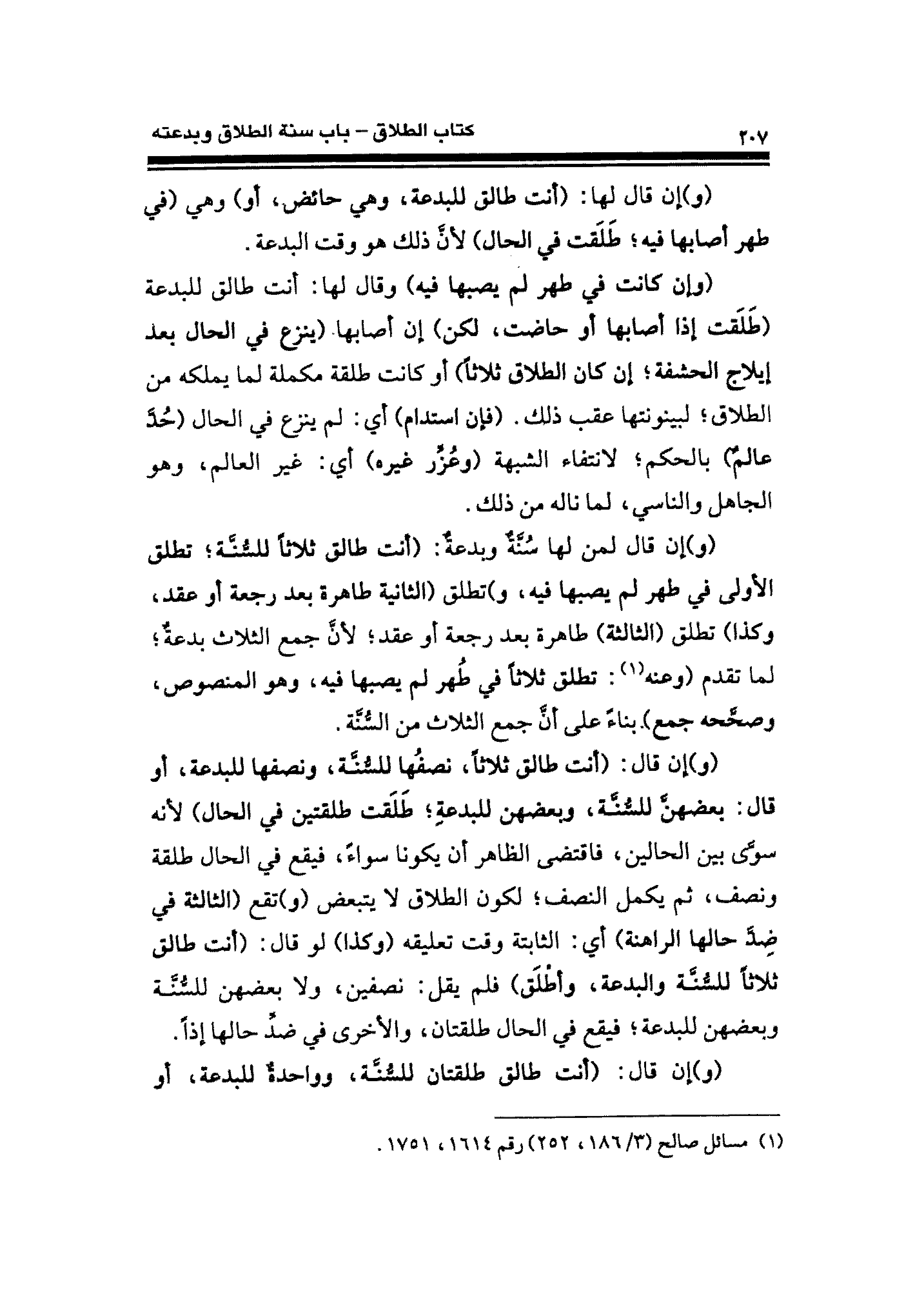 (و) إن قال لمن لها سُنَّةٌ وبدعة: (أنت طالق ثلاثًا للسُّنَّة؛ تطلق الأولى في طهر لم يصبها فيه، و) تطلق (الثانية طاهرة بعد رجعة أو عقد، وكذا) تطلق (الثالثة) طاهرة بعد رجعة أو عقد؛ لأنَّ جمع الثلاث بدعةٌ؛ لما تقدم (وعنه (¬١): نطلق ثلاثًا في طهر لم يصبها فيه، وهو المنصوص، وصحَّحه جمع). بناءً على أن جمع الثلاث من السُّنَّة.