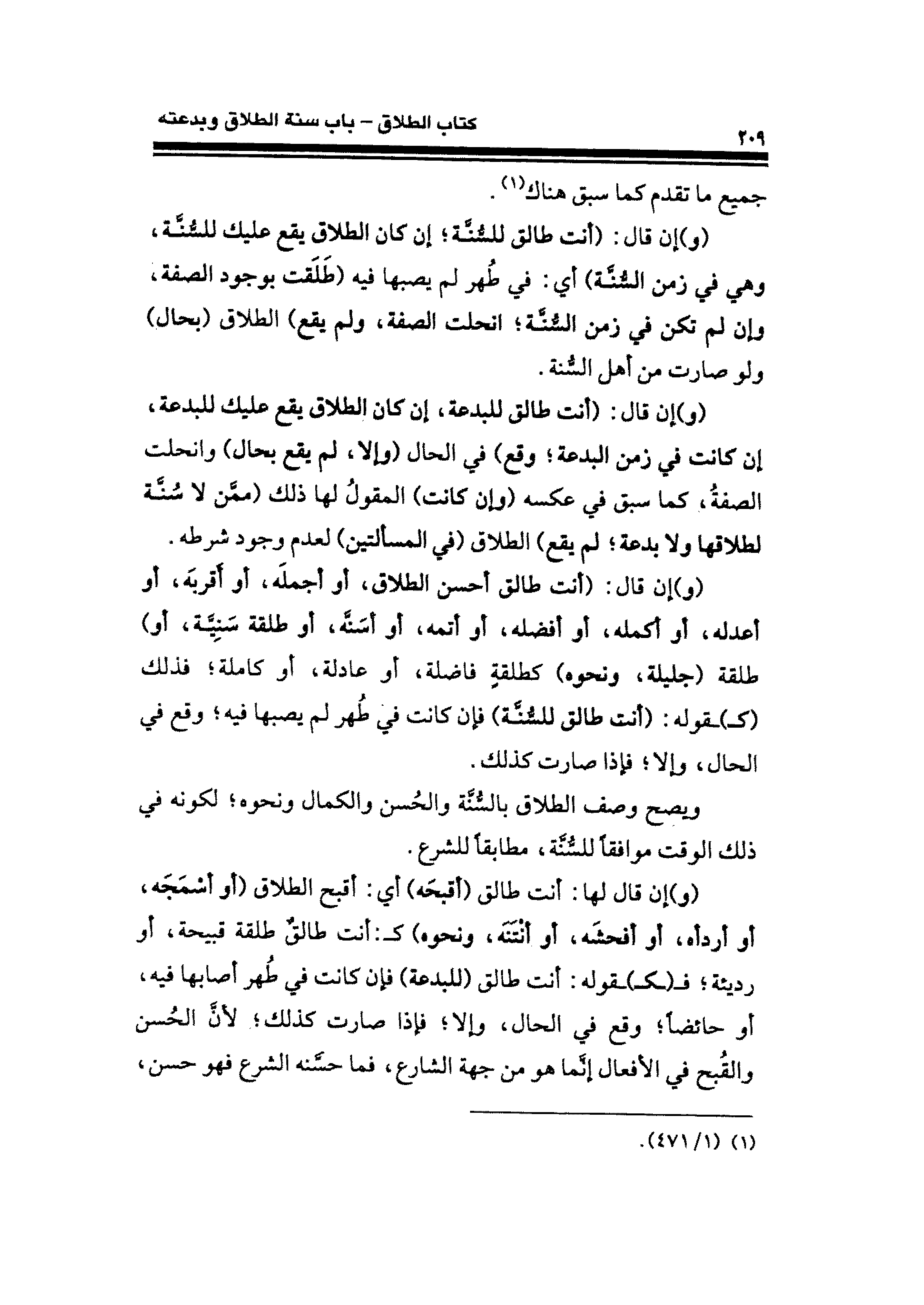 ويصح وصف الطلاق بالسنة والحُسن والكمال ونحوه؛ لكونه في ذلك الوقت موافقًا للسنة، مطابقًا للشرع.