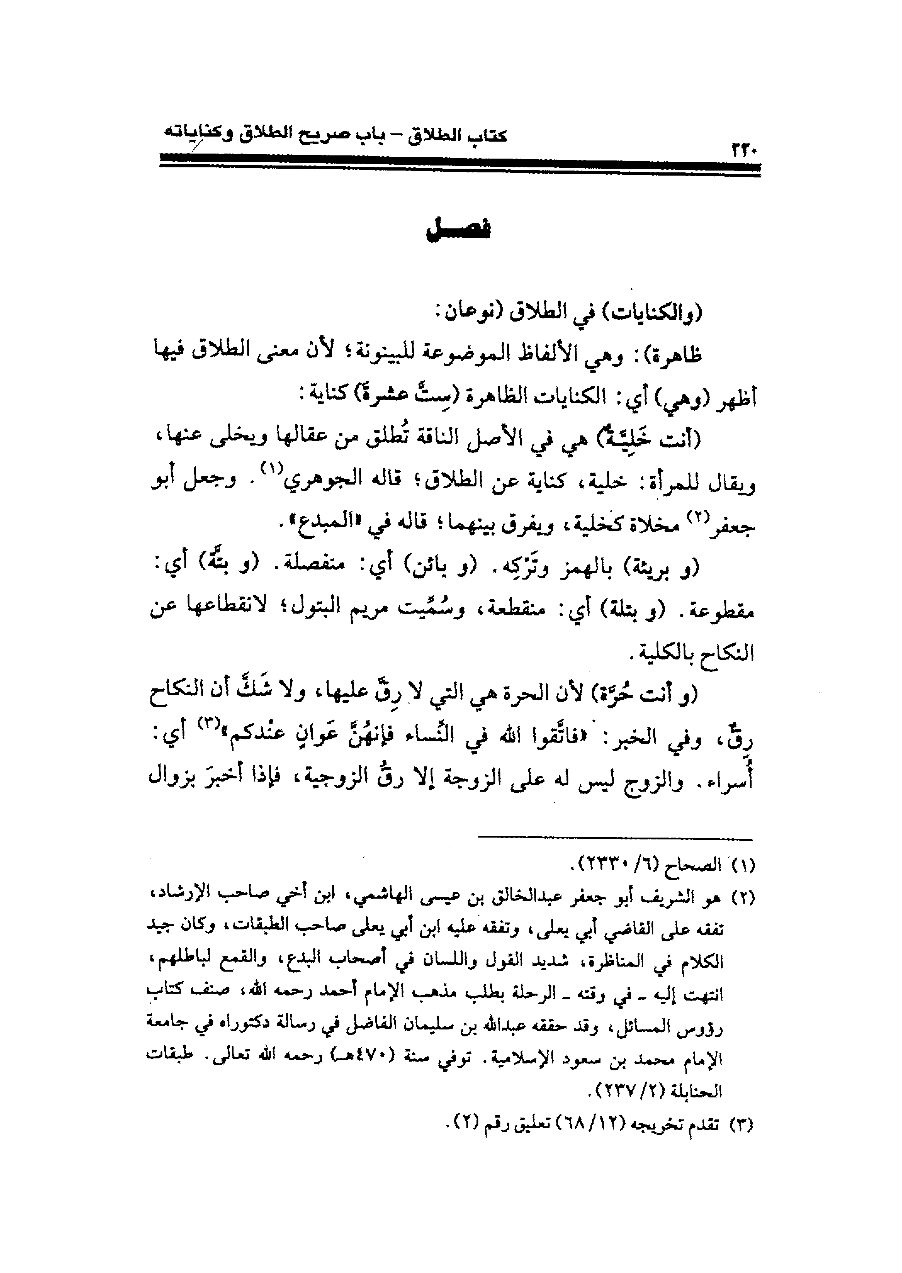 (¬٢) هو الشريف أبو جعفر عبد الخالق بن عيسى الهاشمي، ابن أخي صاحب الإرشاد، تفقه على القاضي أبي يعلى، وتفقه عليه ابن أبي يعلى صاحب الطبقات، وكان جيد الكلام في المناظرة، شديد القول واللسان في أصحاب البدع، والقمع لباطلهم، انتهت إليه -في وقته- الرحلة بطلب مذهب الإمام أحمد رحمه الله، صنف كتاب رؤوس المسائل، وقد حققه عبد الله بن سليمان الفاضل في رسالة دكتواره في جامعة الإمام محمد بن سعود الإسلامية. توفي سنة (٤٧٠ هـ) رحمه الله تعالى. طبقات الحنابلة (٢/ ٢٣٧).