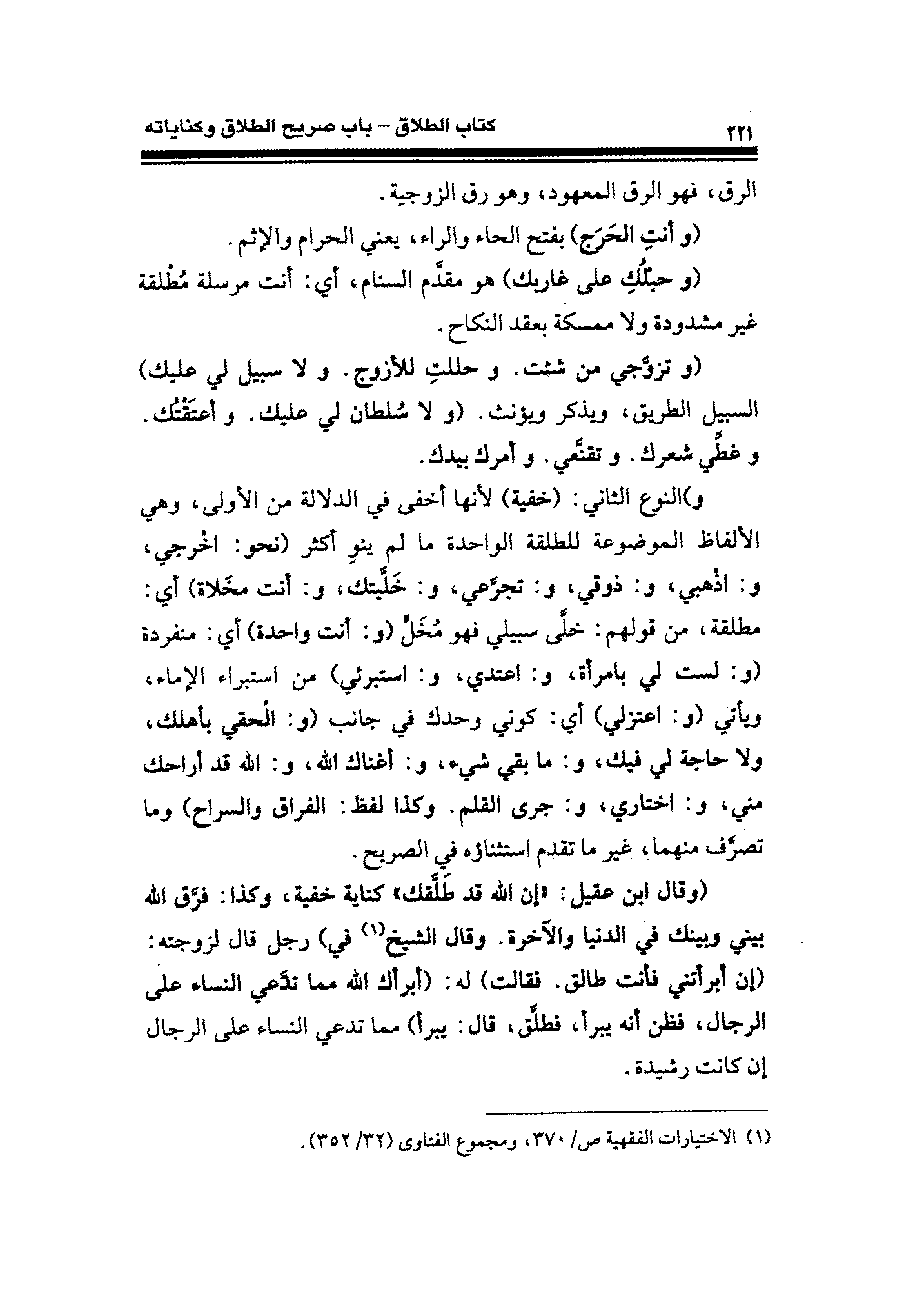 و) النوع الثاني: (خفية) لأنها أخفى في الدلالة من الأولى، وهي الألفاظ الموضوعة للطلقة الواحدة ما لم ينو أكثر (نحو: أخْرجي، و: اذهبي، و: ذوقي، و: تجرَّعي، و: خَلَّيتك، و: أنت مخَلاة) أي: مطلقة، من قولهم: خلَّى سبيلي فهو مُخَلٍّ (و: أنت واحدة) أي: منفردة (و: لست لي بامرأة، و: اعتدي، و: استبرئي) من استبراء الإماء، ويأتي (و: اعتزلي) أي: كوني وحدك في جانب (و: الحقي بأهلك، ولا حاجة لي فيك، و: ما بقي شيء، و: أغناك الله، و: الله قد أراحك مني، و: اختاري، و: جرى القلم. وكذا لفظ: الفراق والسراح) وما تصرَّف منهما؛ غير ما تقدم استثناؤه في الصريح.