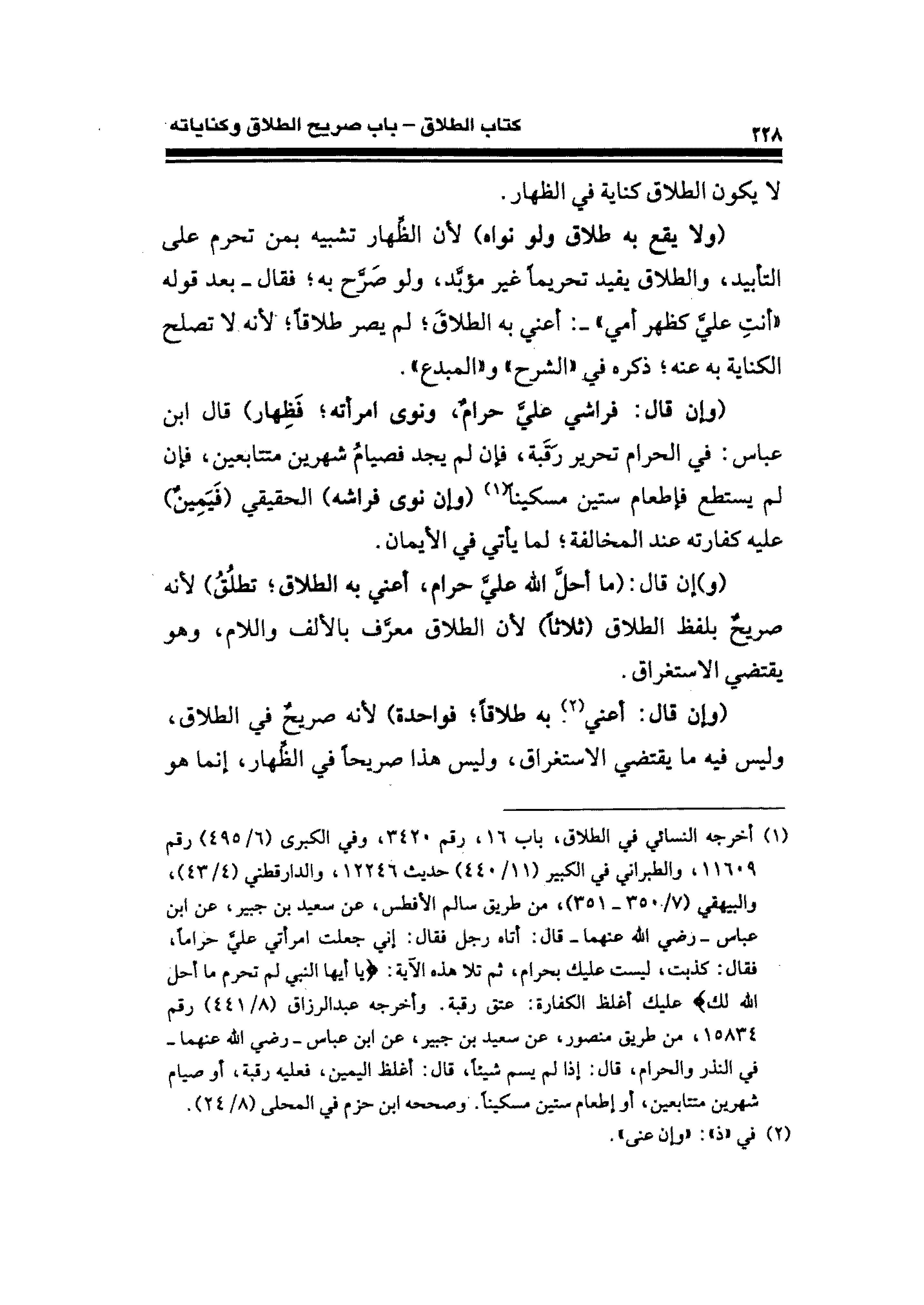 (¬١) أخرجه النسائي في الطلاق، باب ١٦، رقم ٣٤٢٠، وفي الكبرى (٦/ ٤٩٥) رقم ١١٦٠٩، والطبراني في الكبير (١١/ ٤٤٠) حديث ١٢٢٤٦، والدارقطني (٤/ ٤٣)، والبيهقي (٧/ ٣٥٠ - ٣٥١)، من طريق سالم الأفطس، عن سعيد بن جبير، عن ابن عباس - رضي الله عنهما - قال: أتاه رجل فقال: إني جعلت امرأتي عليَّ حرامًا، فقال: كذبت، ليست عليك بحرام، ثم تلا هذه الآية: {يَا أَيُّهَا النَّبِيُّ لِمَ تُحَرِّمُ مَا أَحَلَّ اللَّهُ لَكَ} عليك أغلظ الكفارة: عتق رقبة. وأخرجه عبد الرزاق (٨/ ٤٤١) رقم ١٥٨٣٤، من طريق منصور، عن سعيد بن جبير، عن ابن عباس - رضي الله عنهما - في النذر والحرام، قال: إذا لم يسم شيئًا، قال: أغلظ اليمين، فعليه رقبة، أو صيام شهرين متتابعين، أو إطعام ستين مسكينًا. وصححه ابن حزم في المحلى (٨/ ٢٤).