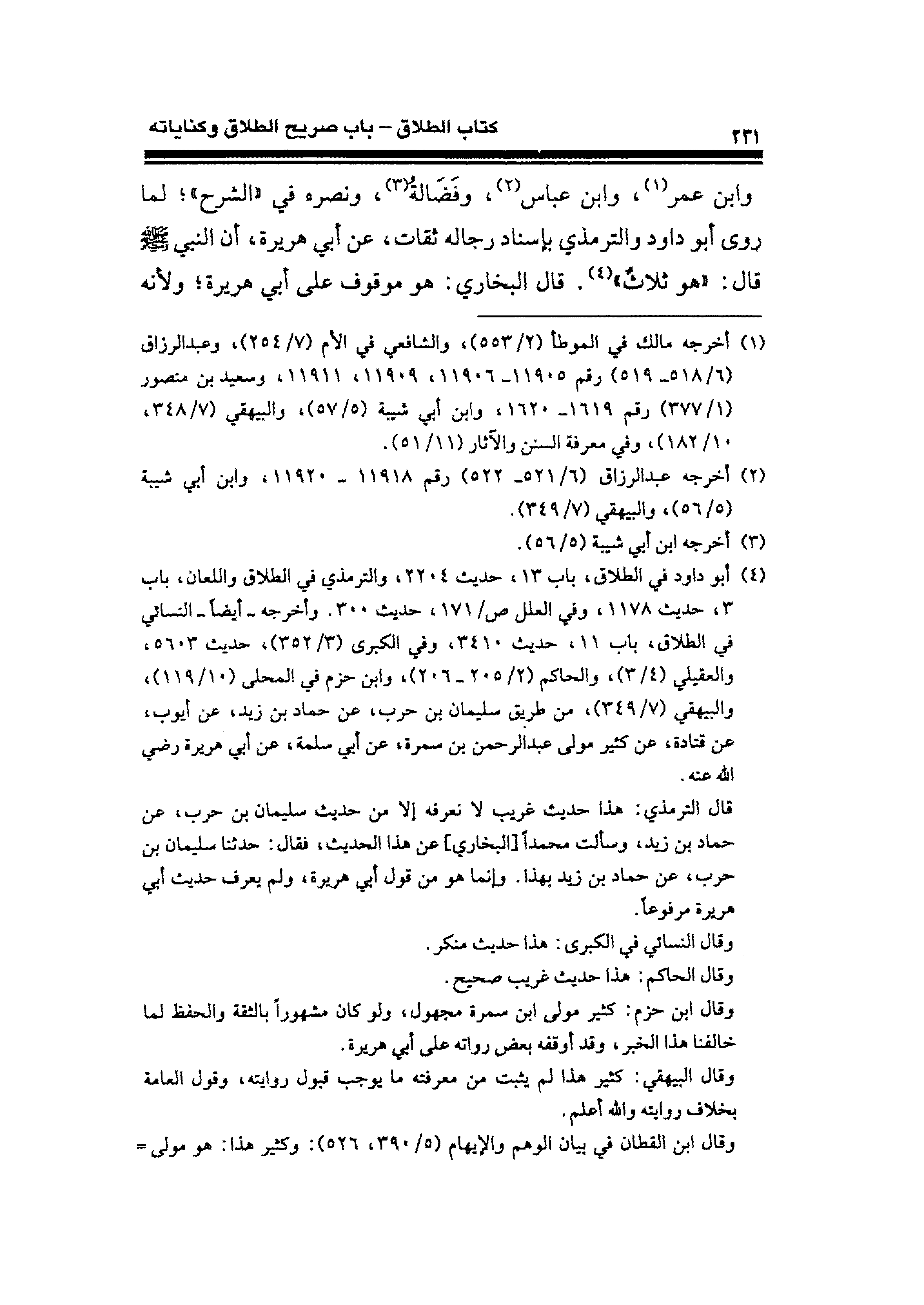 (¬٤) أبو داود في الطلاق، باب ١٣، حديث ٢٢٠٤، والترمذي في الطلاق واللعان، باب ٣، حديث ١١٧٨، وفي العلل ص / ١٧١، حديث ٣٠٠. وأخرجه -أيضًا- النسائي في الطلاق، باب ١١، حديث ٣٤١٠، وفي الكبرى (٣/ ٣٥٢)، حديث ٥٦٠٣، والعقيلي (٤/ ٣)، والحاكم (٢/ ٢٠٥ - ٢٠٦)، وابن حزم في المحلى (١٠/ ١١٩)، والبيهقي (٧/ ٣٤٩)، من طريق سليمان بن حرب، عن حماد بن زيد، عن أيوب، عن قتادة، عن كثير مولى عبد الرحمن بن سمرة، عن أبي سلمة، عن أبي هريرة رضي الله عنه.