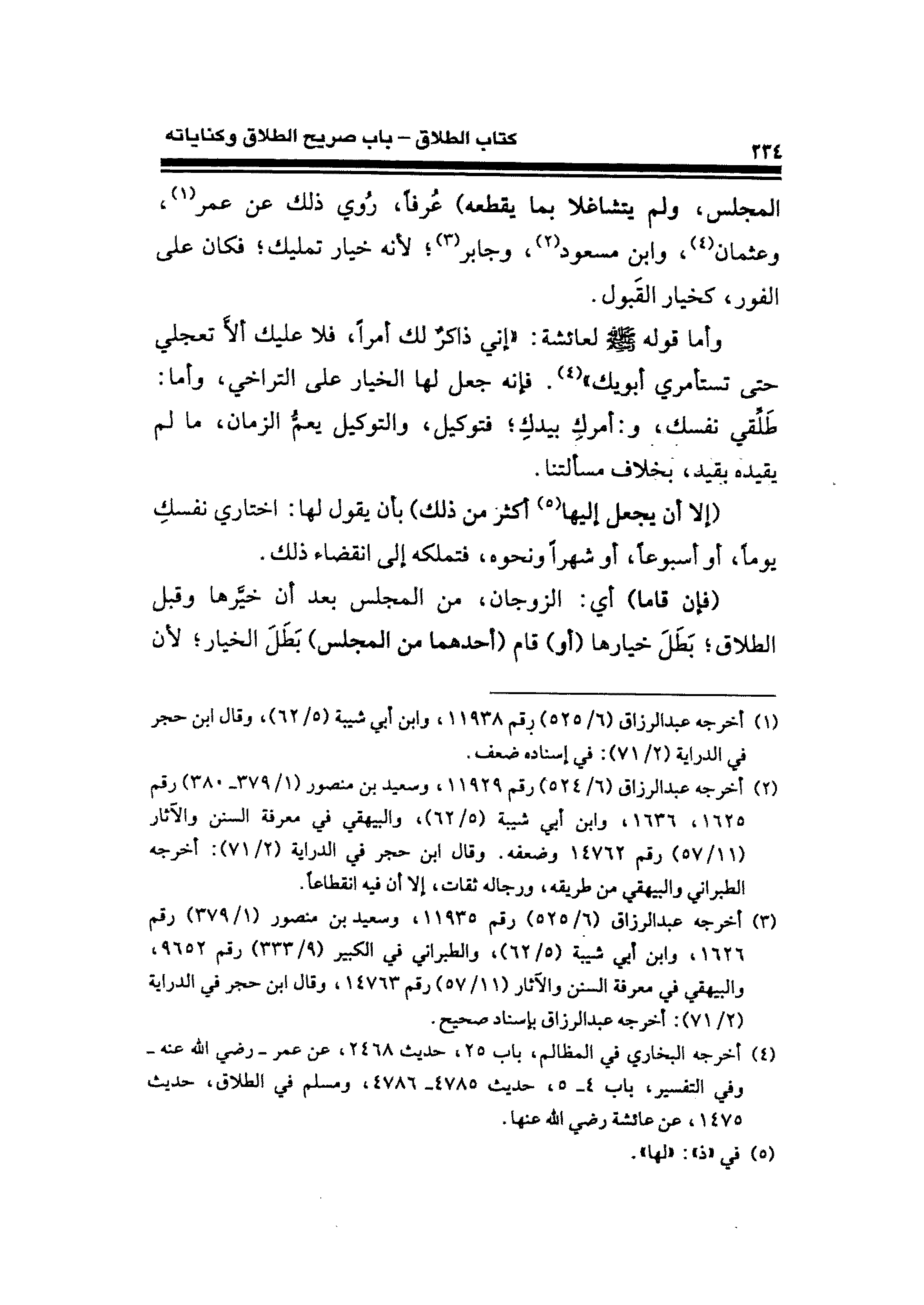 وأما قوله - صلى الله عليه وسلم - لعائشة: "إني ذكرٌ لك أمرًا، فلا عليك ألَّا تعجلي حتى تستأمري أبويك" (¬٤). فإنه جعل لها الخيار على التراخي، وأما: طَلِّقي نفسك، و: أمرك بيدكِ؛ فتوكيل، والتوكيل يعمُّ الزمان، ما لم يقيده بقيد؛ بخلاف مسألتنا.