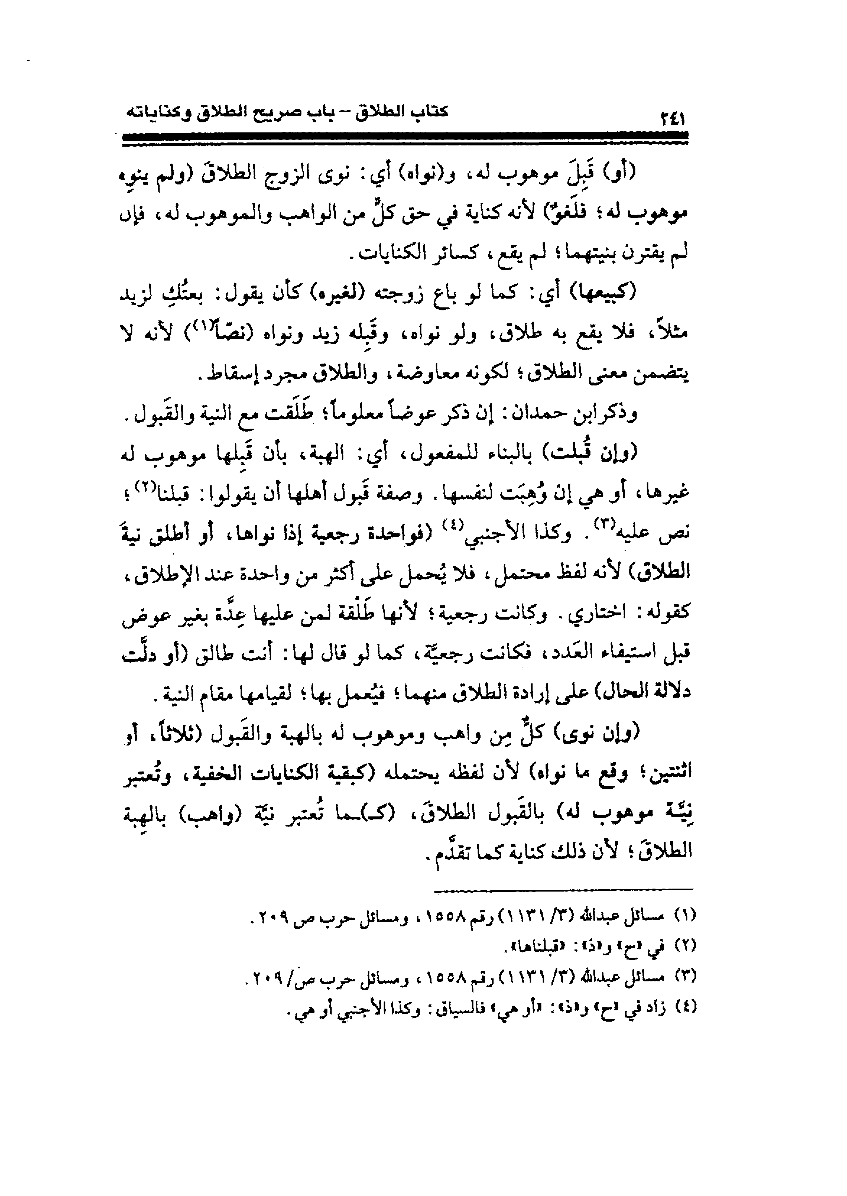 (وإن قُبلت) بالبناء للمفعول، أي: الهبة، بأن قَبِلها موهوب له غيرها، أو هي إن وُهِبَت لنفسها. وصفة قَبول أهلها أن يقولوا: قبلنا (¬٢)؛ نص عليه (¬٣). وكذا الأجنبي (¬٤) (فواحدة رجعية إذا نواها، أو أطلق نيةَ الطلاق) لأنه لفظ محتمل، فلا يُحمل على أكثر من واحدة عند الإطلاق، كقوله: اختاري. وكانت رجعية؛ لأنها طَلْقة لمن عليها عِدَّة بغير عوض قبل استيفاء العَدد، فكانت رجعيَّة، كما لو قال لها: أَنْتَ طالق (أو دلَّت دلالة الحال) على إرادة الطلاق منهما؛ فيُعمل بها؛ لقيامها مقام النية.