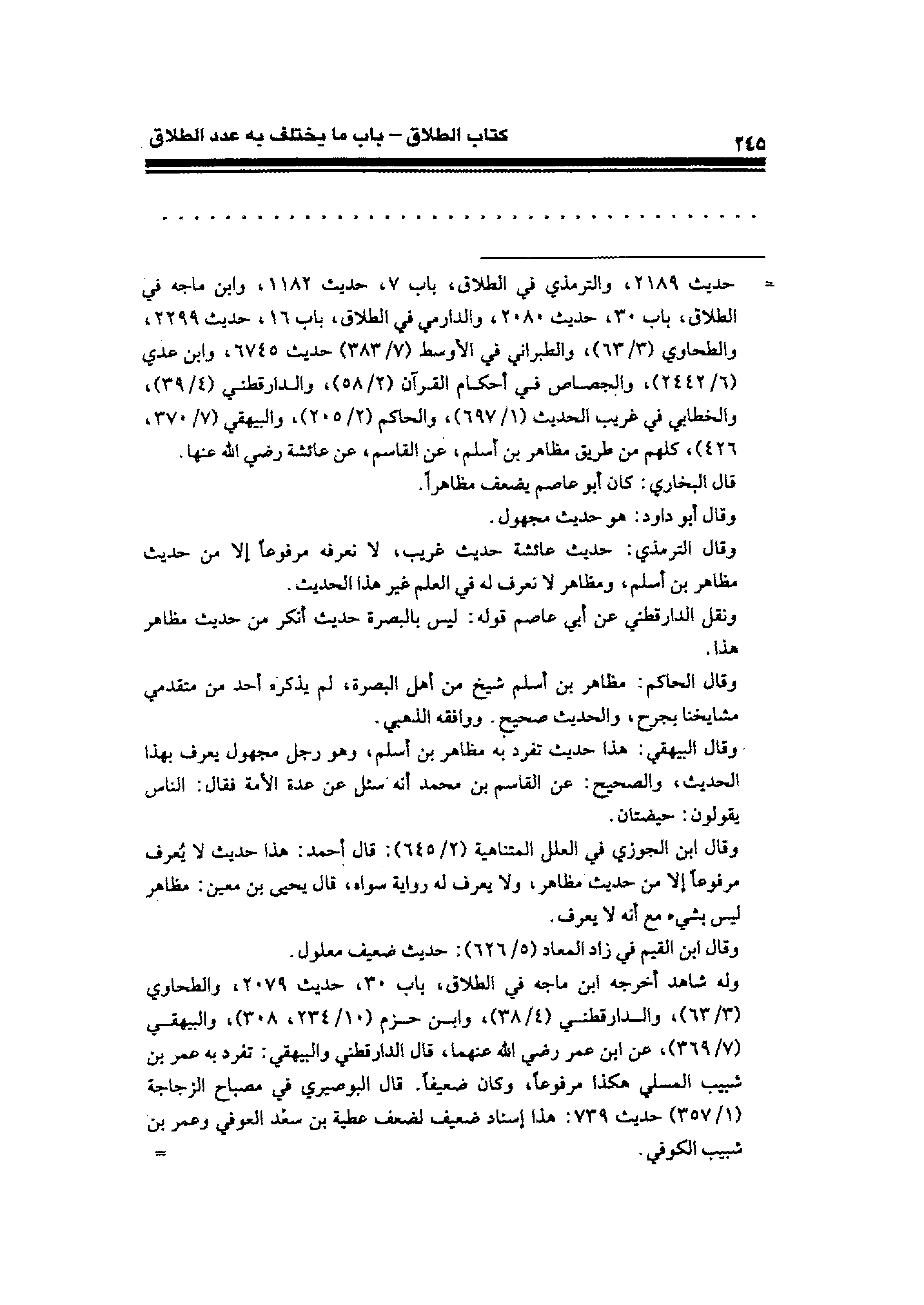 = حديث ٢١٨٩، والترمذي في الطلاق، باب ٧، حديث ١١٨٢، وابن ماجه في الطلاق، باب ٣٠، حديث ٢٠٨٠، والدارمي فِي الطلاق، باب ١٦، حديث ٢٢٩٩، والطحاوي (٣/ ٦٣)، والطبراني فِي الأوسط (٧/ ٣٨٣) حديث ٦٧٤٥، وابن عدي (٦/ ٢٤٤٢)، والجصاص في أحكام القرآن (٢/ ٥٨)، والدَّارَقُطْنِيّ (٤/ ٣٩)، والخطابي في غريب الحديث (١/ ٦٩٧)، والحاكم (٢/ ٢٠٥)، والبيهقي (٧/ ٣٧٠، ٤٢٦)، كلهم من طريق مظاهر بن أسلم، عن القاسم، عنَ عائشة رضي الله عنها.