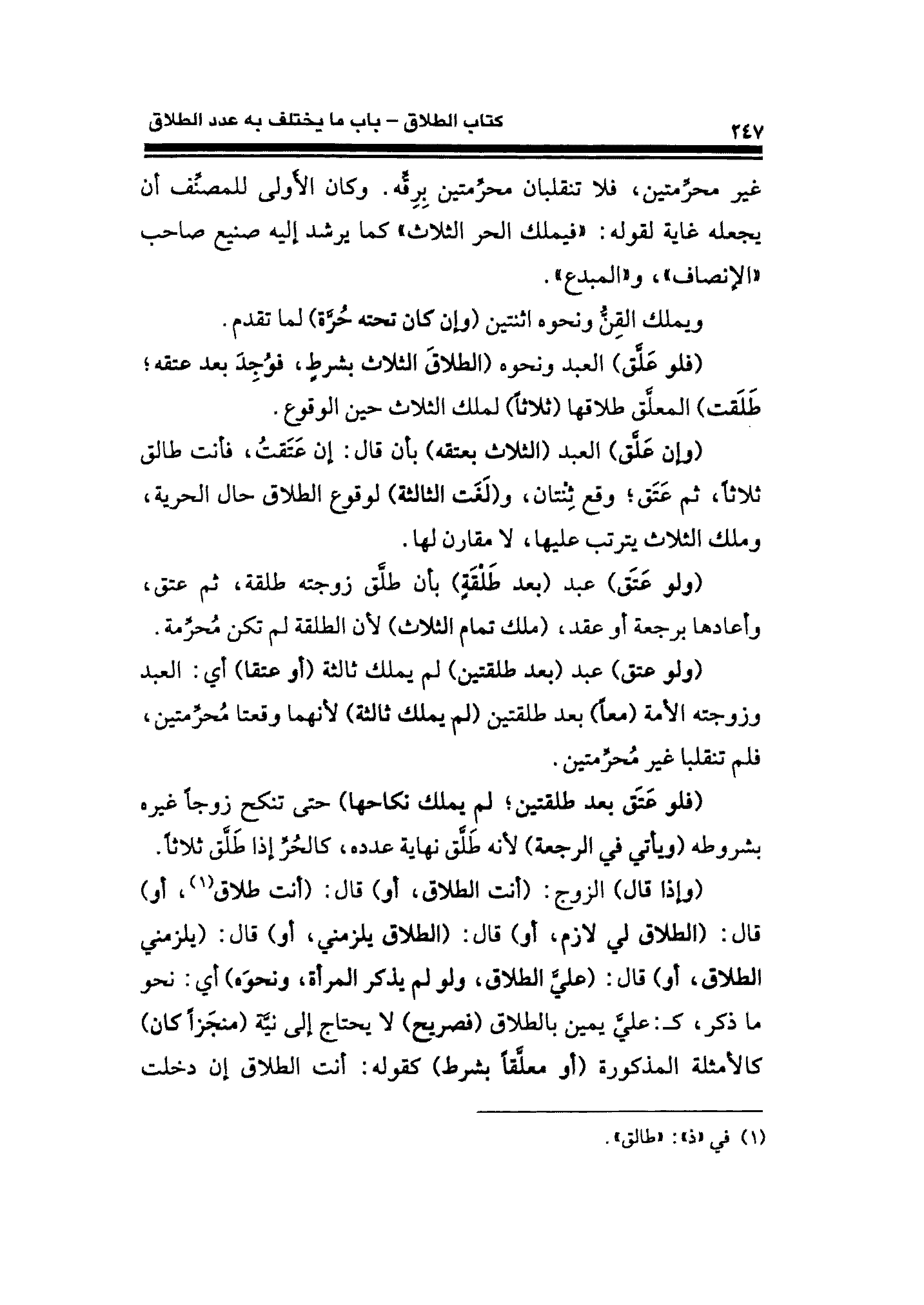 غير محرِّمتين، فلا تنقلبان محرِّمتين بِرِقّه. وكان الأولى للمصنِّف أن يجعله غاية لقوله: "فيملك الحُر الثلاث" كما يرشد إليه صنيع صاحب "الإنصاف"، و"المبدع".