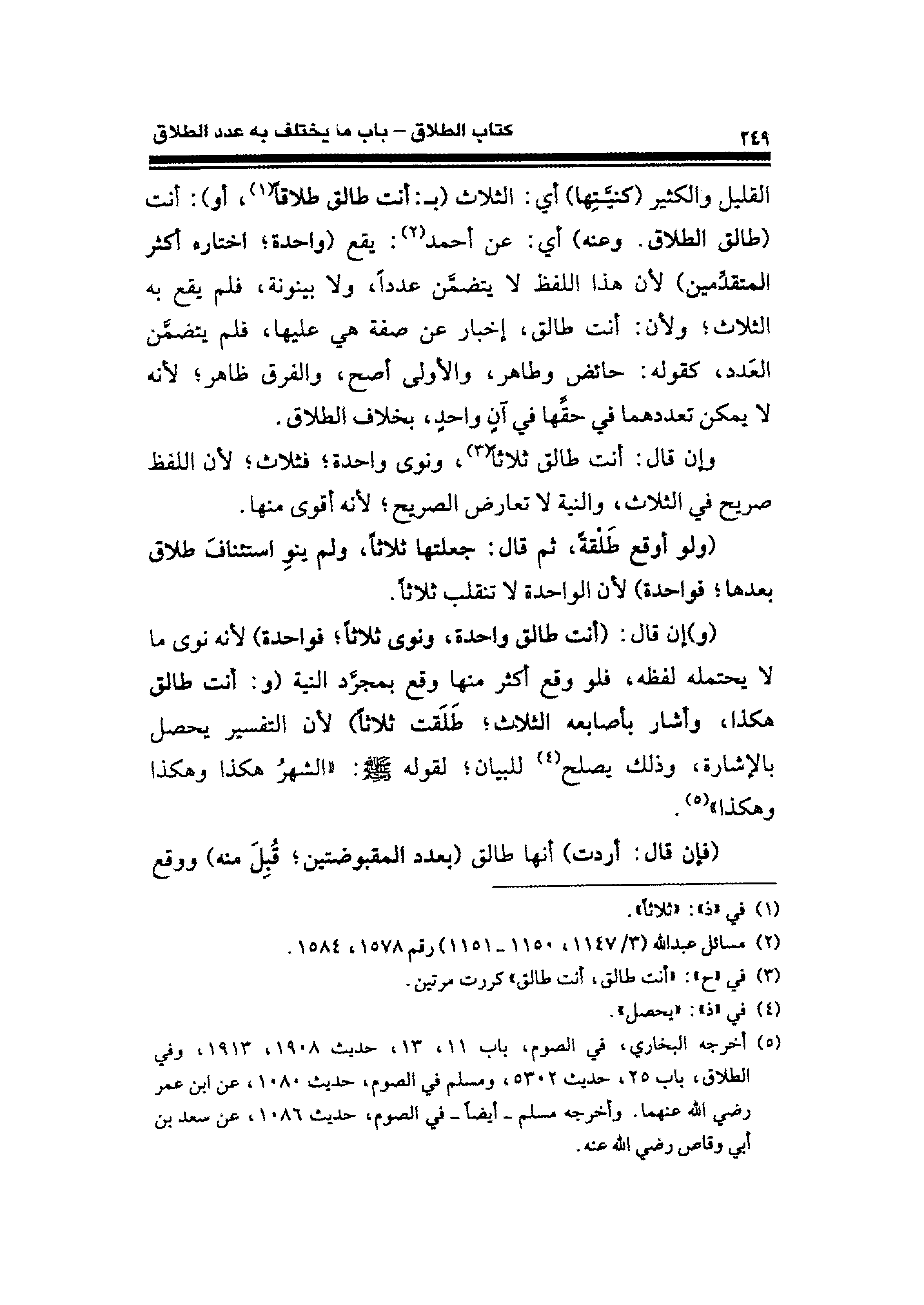 القليل والكثير (كنيَّتِها) أي: الثلاث (بـ: أنت طالق طلاقًا (¬١)، أو): أنت (طالق الطلاق. وعنه) أي: عن أحمد (¬٢): يقع (واحد؛ اختاره أكثر المُتقدِّمين) لأن هذا اللفظ لا يتضمَّن عددًا، ولا بينونة، فلم يقع به الثلاث؛ ولأن: أنت طالق، إخبار عن صفة هي عليها، فلم يتضمَّن العَدد، كقوله: حائض وطاهر، والأولى أصح، والفرق ظاهر؛ لأنه لا يمكن تعددهما في حقِّها في آنٍ واحدٍ، بخلاف الطلاق.
