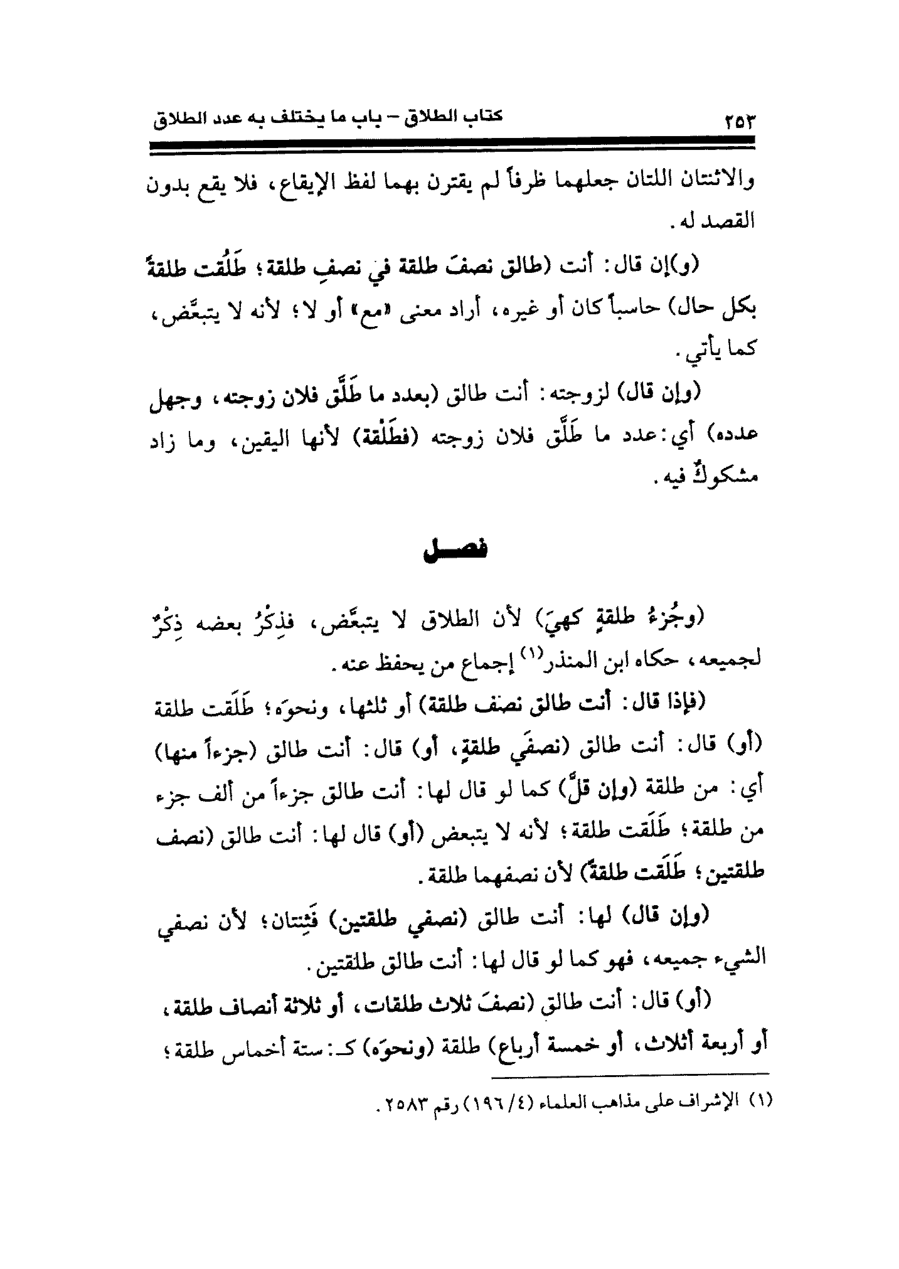 (وجُزءُ طلقةٍ كهيَ) لأن الطلاق لا يتبعَّض، فذِكْرُ بعضه ذِكْرٌ لجميعه، حكاه ابن المنذر (¬١) إجماع من يحفظ عنه،