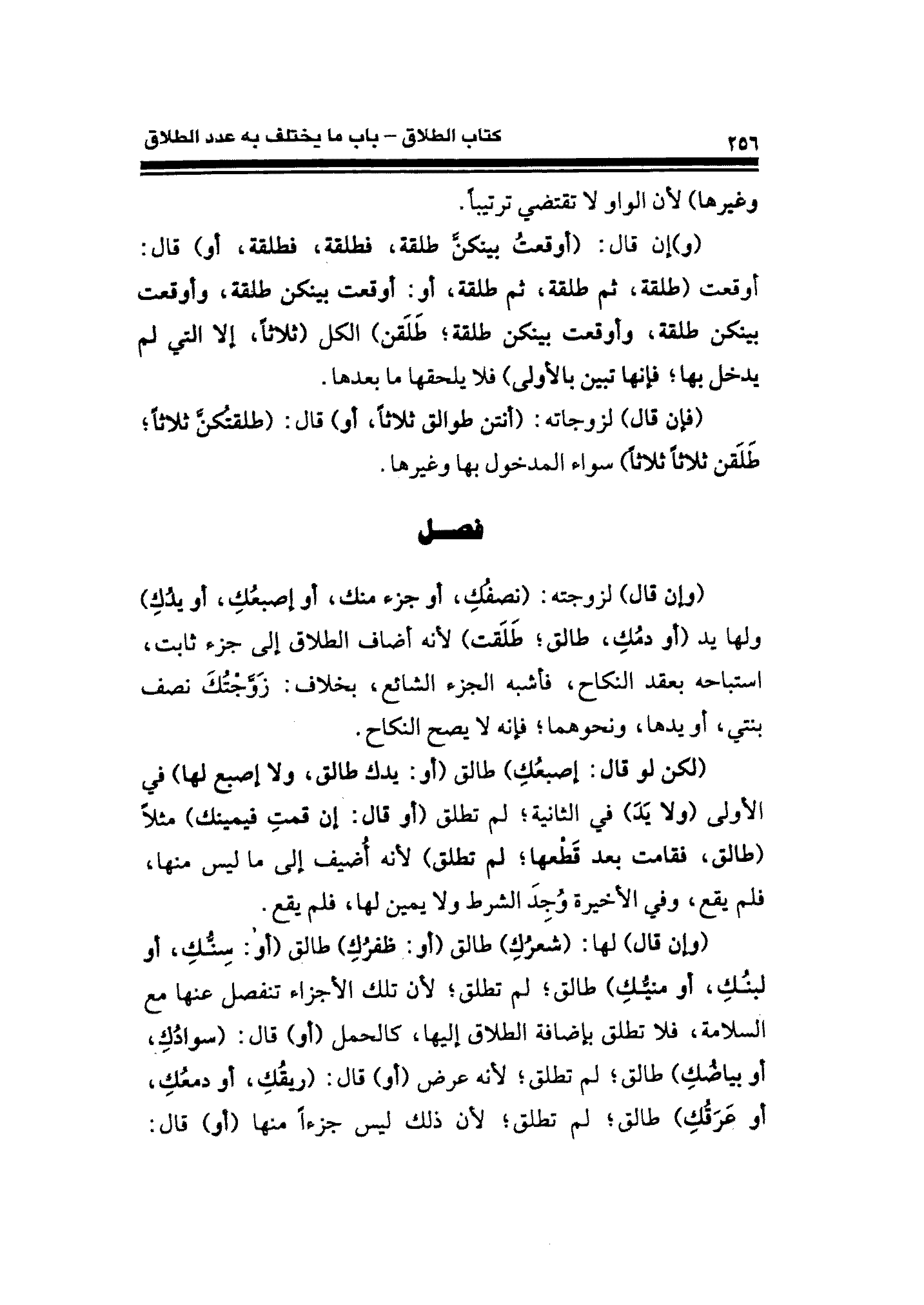 (وإن قال) لزوجته: (نصفُك، أو جزء منك، أو إصبعُكِ، أو يدُكِ) ولها يد (أو دمُكِ، طالق؛ طَلَقت) لأنه أضاف الطلاق إلى جزء ثابت، استباحه بعقد النكاح؛ فأشبه الجزء الشائع، بخلاف: زَوَّجْتُكَ نصف بنتي، أو يدها، ونحوهما؛ فإنه لا يصح النكاح.