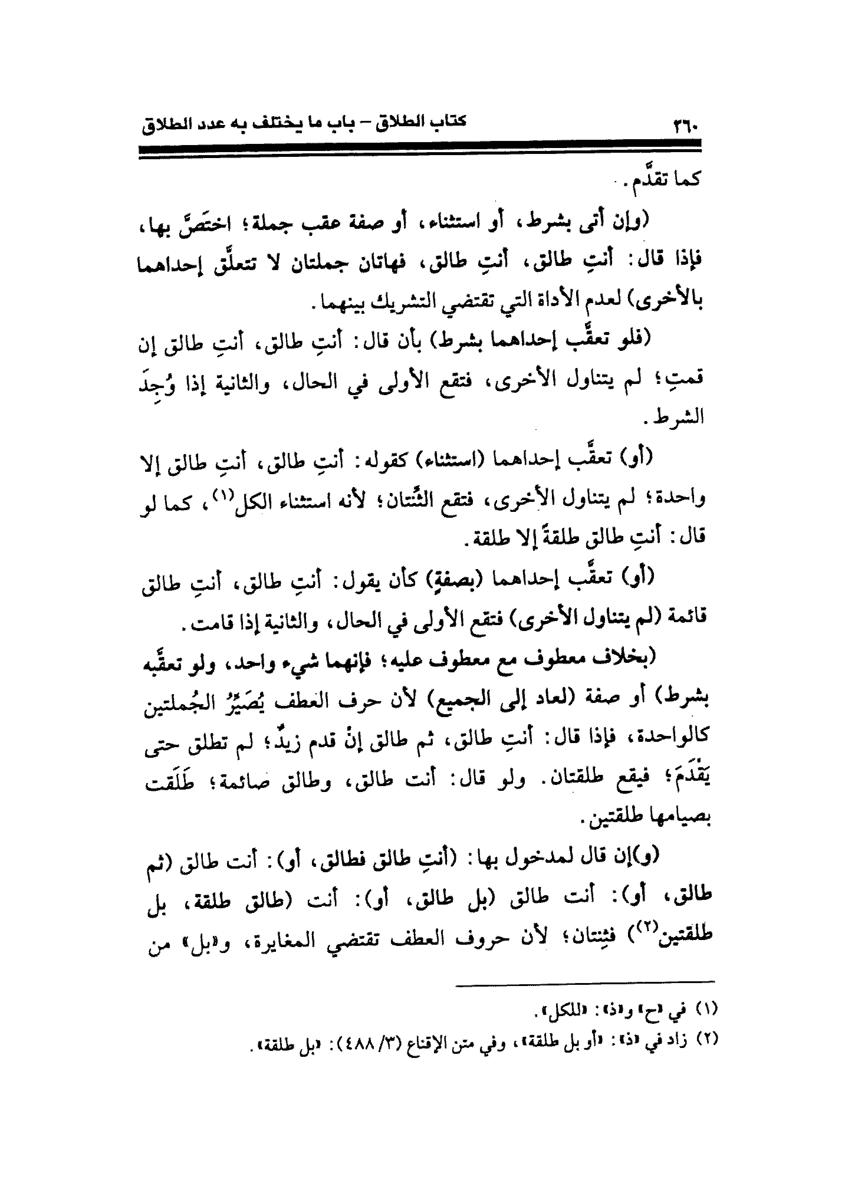 (بخلاف معطوف مع معطوف عليه؛ فإنهما شيء واحد، ولو تعقَّبه بشرط) أو صفة (لعاد إلى الجميع) لأن حرف العطف يُصَيِّرُ الجُملتين كالواحدة، فإذا قال: أنتِ طالق، ثمَّ طالق إنْ قدم زيدٌ؛ لم تطلق حتى يَقْدَمَ؛ فيقع طلقتان. ولو قال: أنت طالق، وطالق صائمة؛ طَلَقت بصيامها طلقتين.
