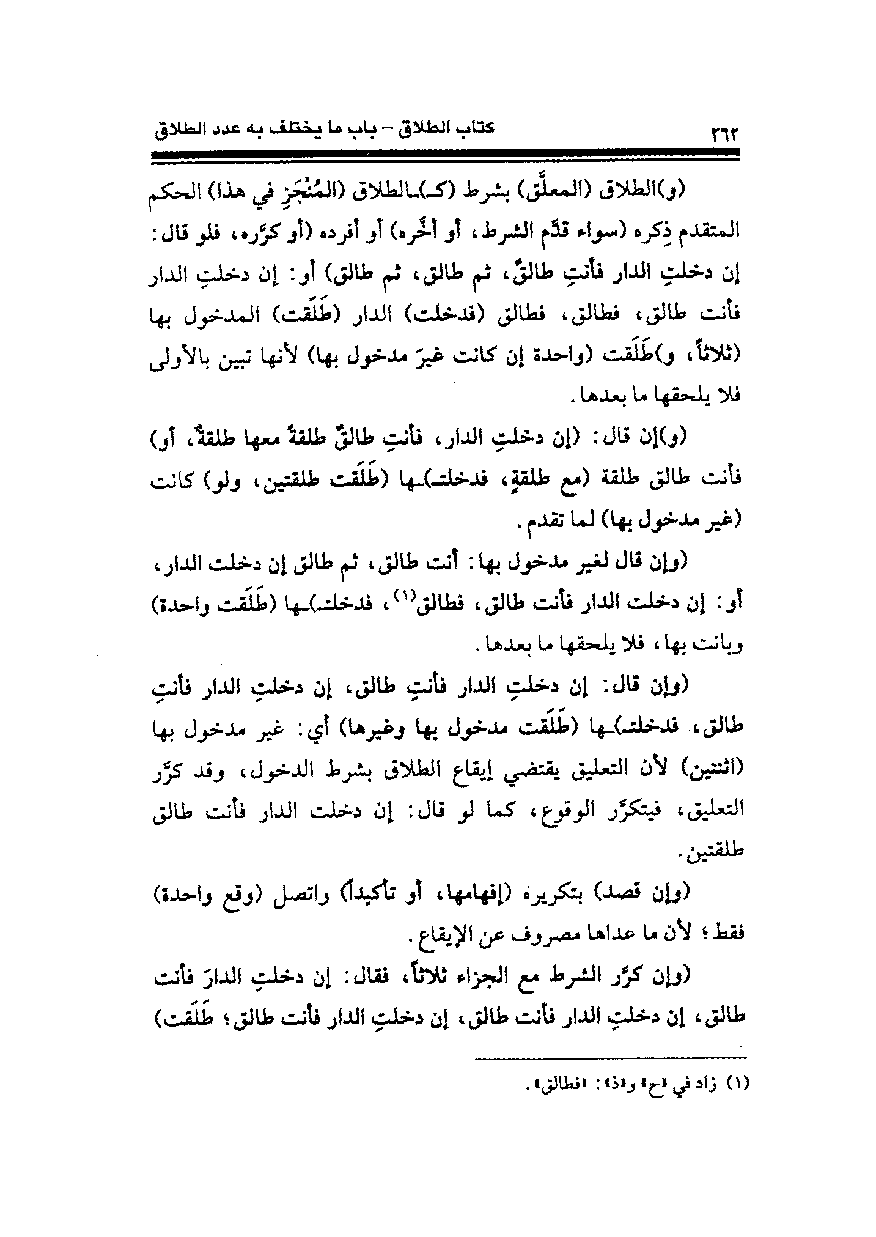 (و) الطلاق (المعلَّق) بشرط (كـ) ـالطلاق (المُنْجَزِ في هذا) الحكم المتقدم ذِكره (سواء قدَّم الشرط، أو آخره) أو أفرده (أو كرَّره، فلو قال: إن دخلتِ الدار فأنتِ طالقٌ، ثمَّ طالق، ثمَّ طالق) أو: إن دخلتِ الدار فأنت طالق، فطالق، فطالق (فدخلت) الدار (طَلَقت) المدخول بها (ثلاثًا، و) طَلَقت (واحدة إن كانت غيرَ مدخول بها) لأنها تبين بالأولى فلا يلحقها ما بعدها.
