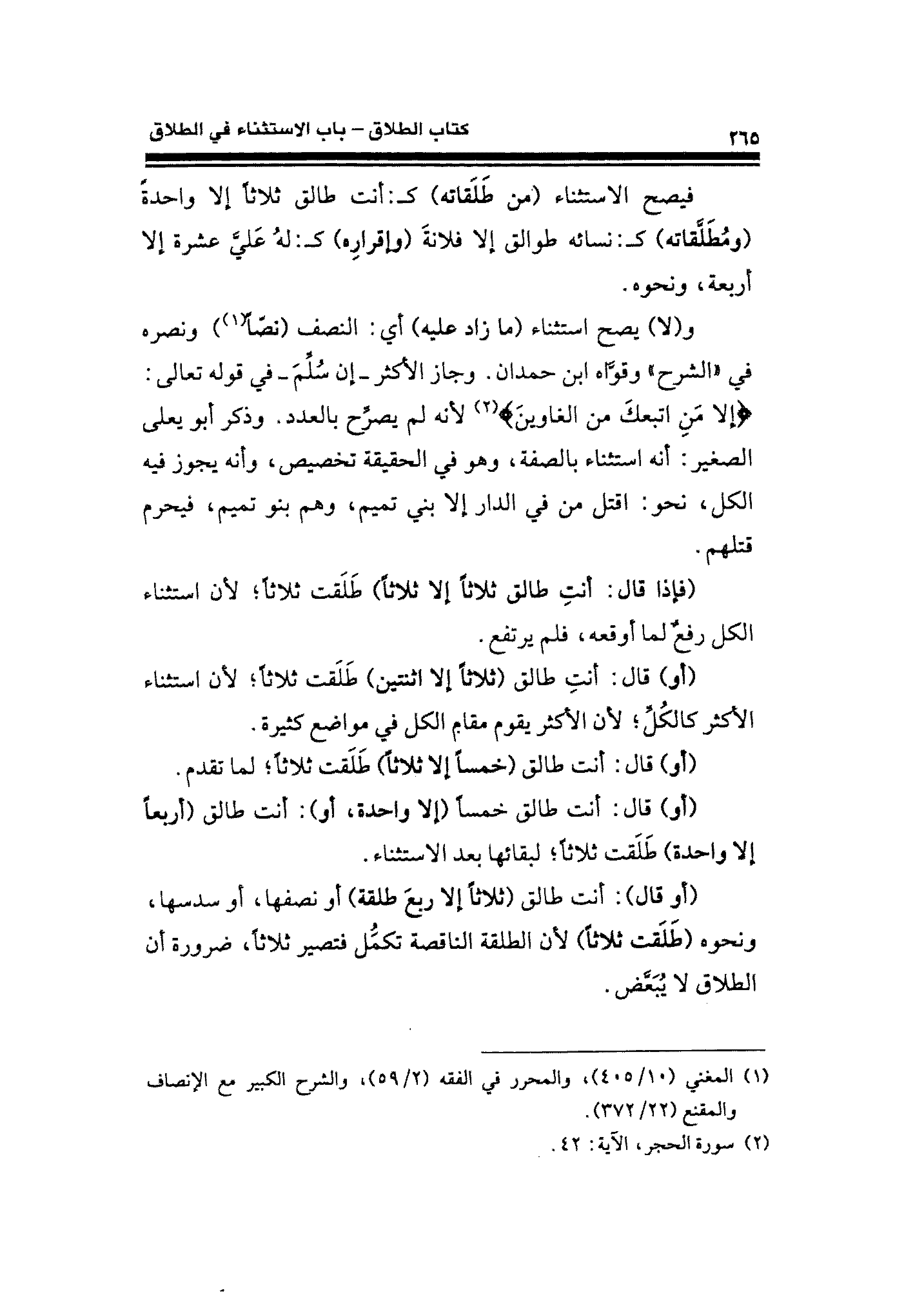 (أو) قال: أنتِ طالق (ثلاثًا إلا اثنتين) طَلَقت ثلاثًا؛ لأن استثناء الأكثر كالكُلِّ؛ لأنَّ الأكثر يقوم مقام الكل في مواضع كثيرة.