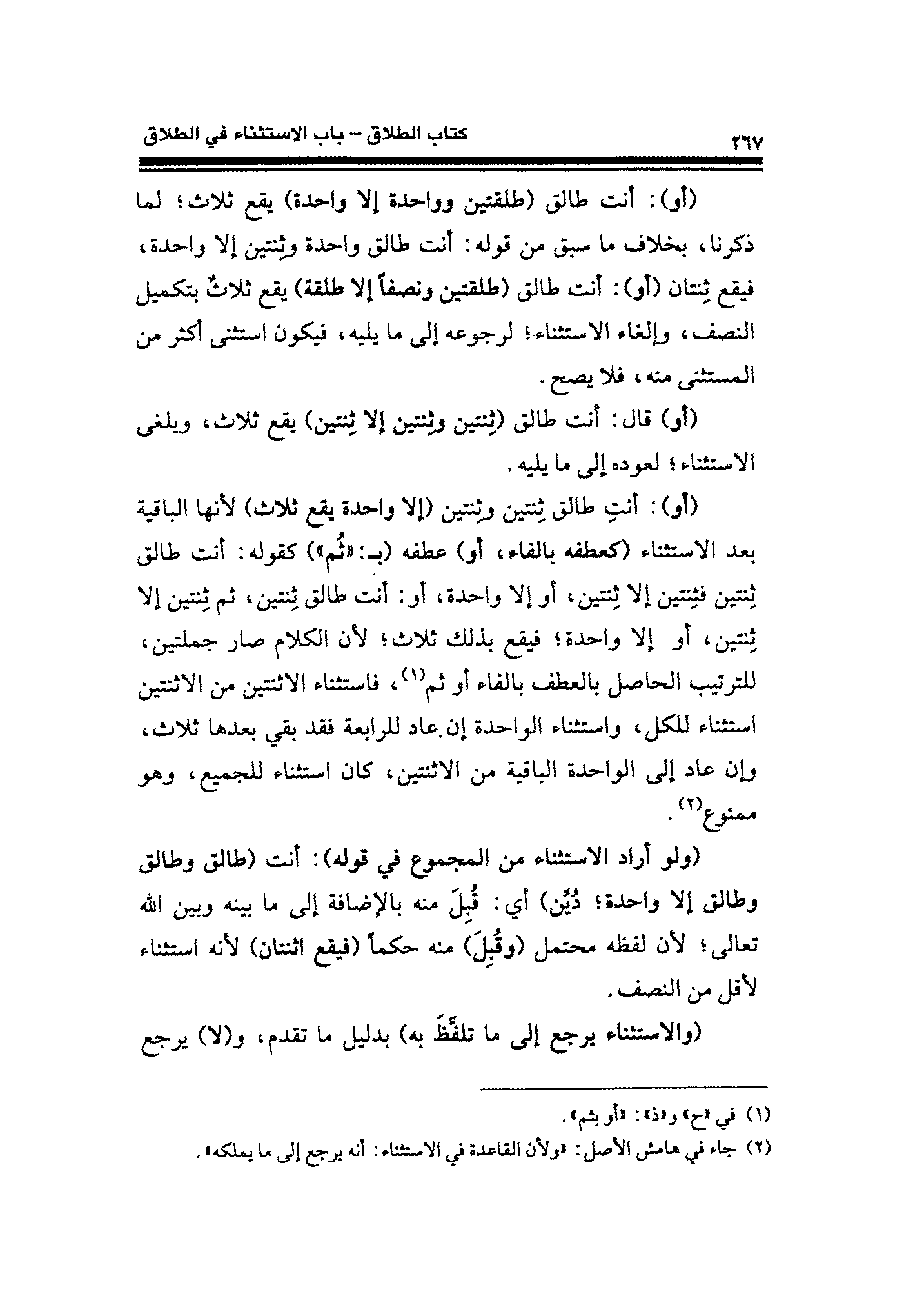 (أو): أنت طالق (طلقتين وواحدة إلا واحدة) يقع ثلاث؛ لما ذكرنا، بخلاف ما سبق من قوله: أنت طالق واحدة وثِنتين إلا واحدة، فيقع ثِنتان (أو): أنت طالق (طلقتين ونصفًا إلا طلقة) يقع ثلاثٌ بتكميل النصف، وإلغاء الاستثناء؛ لرجوعه إلى ما يليه، فيكون استثنى أكثر من المستثنى منه، فلا يصح.