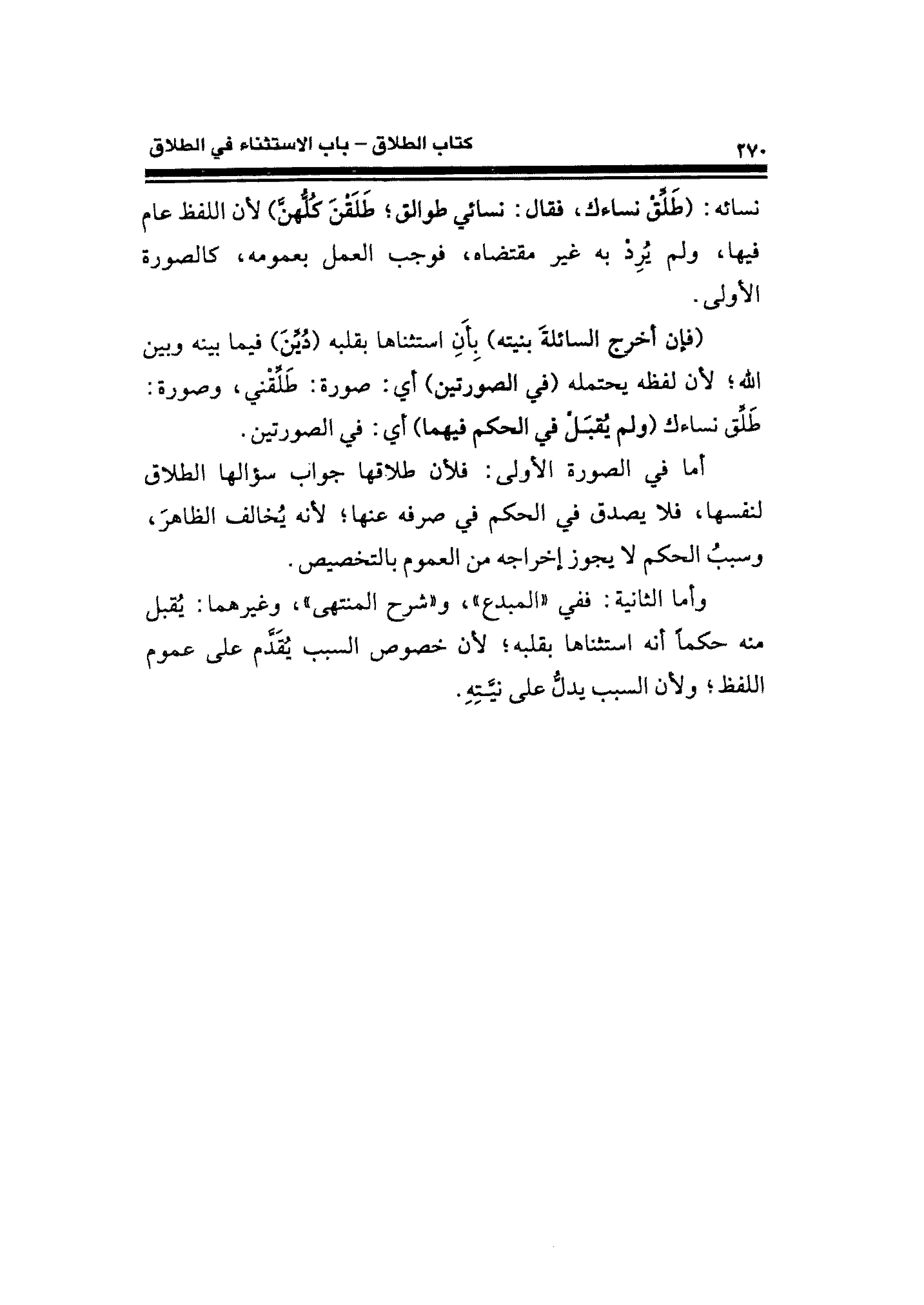وأما الثانية: ففي "المبدع" و"شرح المنتهى"، وغيرهما: يُقبل منه حكمًا أنه استثناءًا بقلبه؛ لأن خصوص السبب يُقدَّم على عموم اللفظ؛ ولأن السبب يدلُّ على نيَّتِهِ.