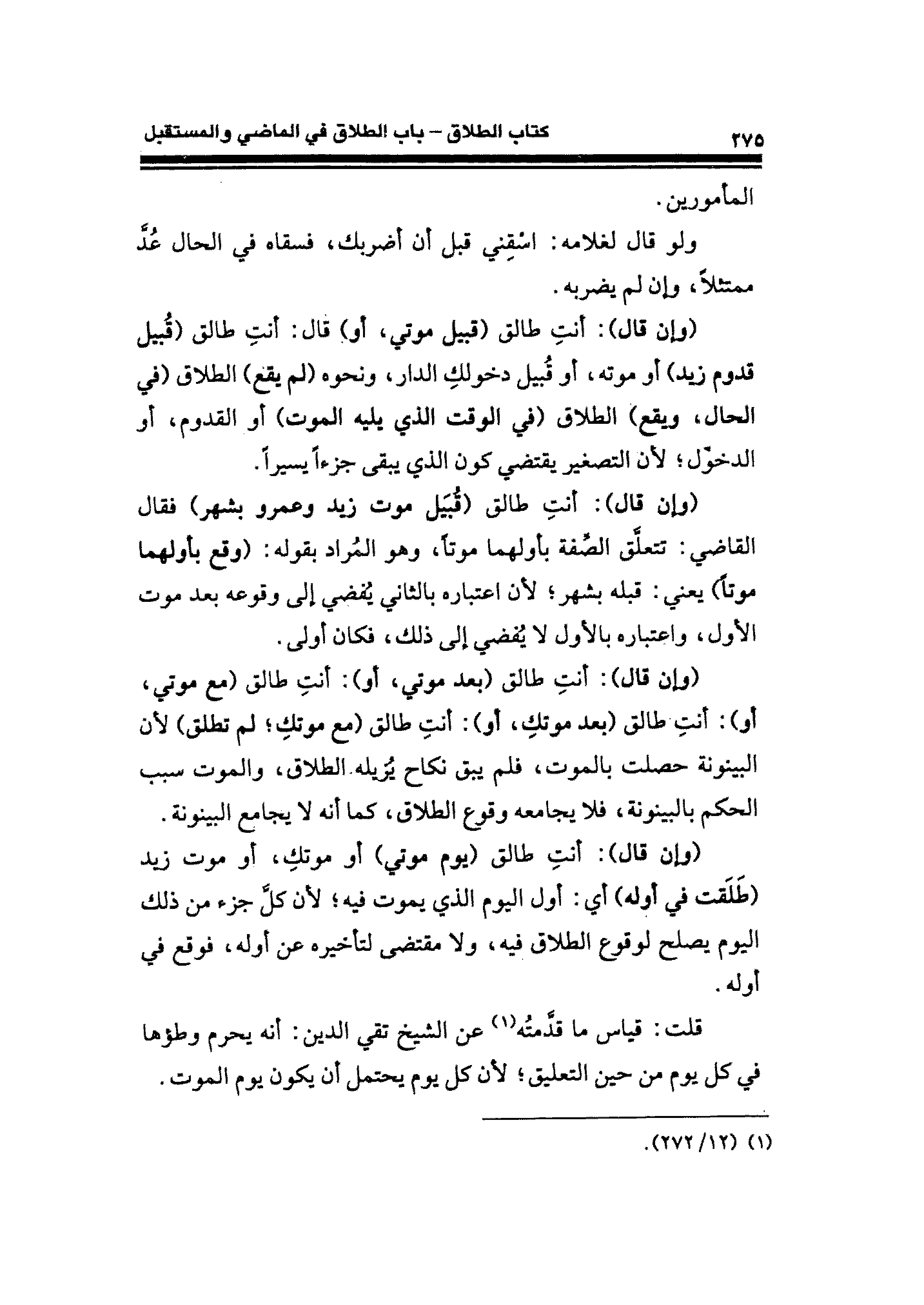 (وإن قال): أنتِ طالق (قُبيَل موت زيد وعمرو بشهر) فقال القاضي: تتعلَّق الصِّفة بأولهما موتًا، وهو المُراد بقوله: (وقع بأولهما موتًا) يعني: قبله بشهر؛ لأن اعتباره بالثاني يُفضي إلي وقوعه بعد موت الأول، واعتباره بالأول لا يُفضي إلى ذلك، فكان أولى.