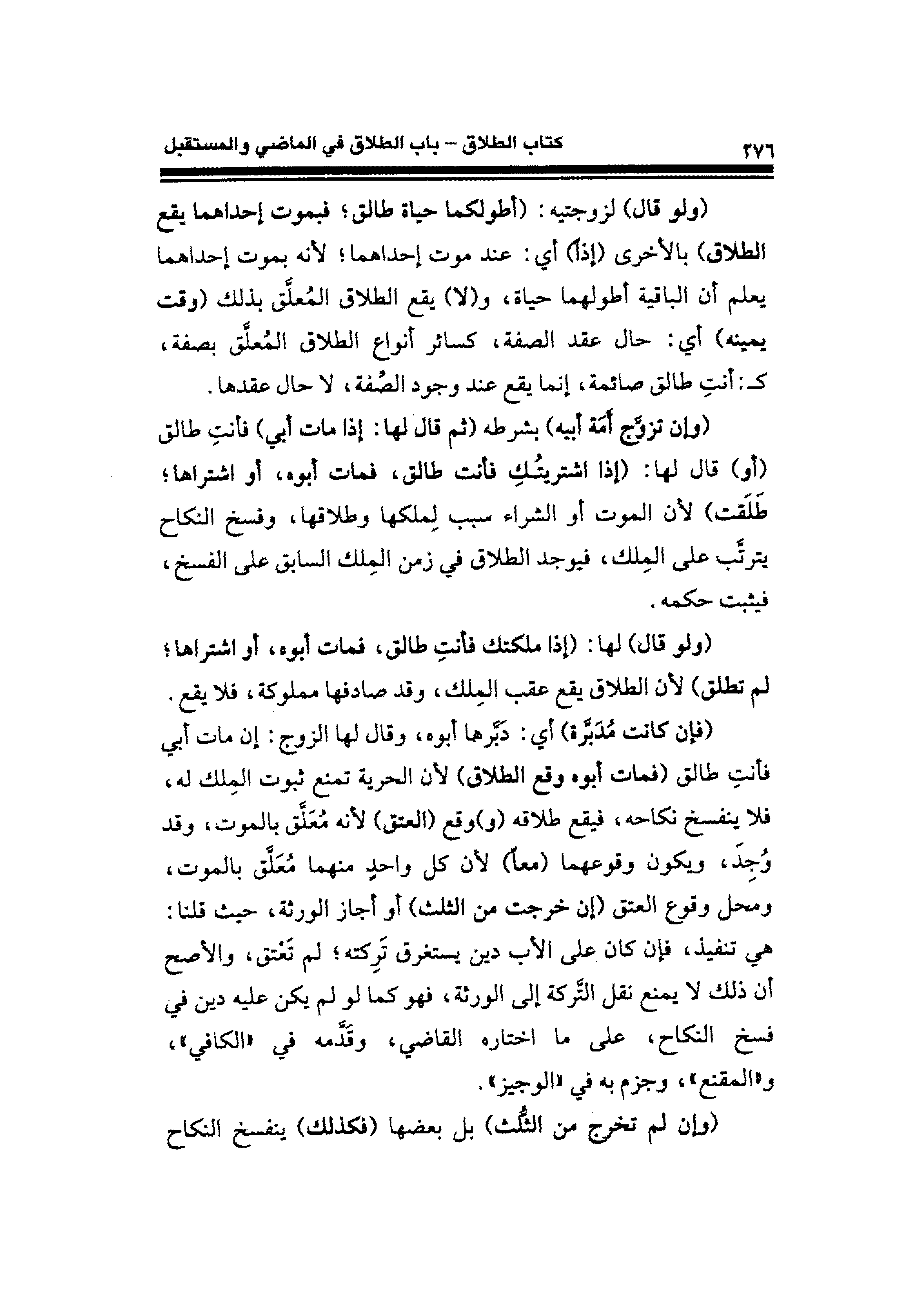 (وإن تزوَّج أَمَة أبيه) بشرطه (ثم قال لها: إذا مات أبي) فأنتِ طالق (أو) قال لها: (إذا اشتريتُكِ فأنت طالق، فمات أبوه، أو اشتراها؛ طَلَقت) لأن الموت أو الشراء سبب لِملكها وطلاقها، وفسخ النكاح يترتَّب على المِلك، فيوجد الطلاق في زمن المِلك السابق على الفسخ، فيثبت حكمه.