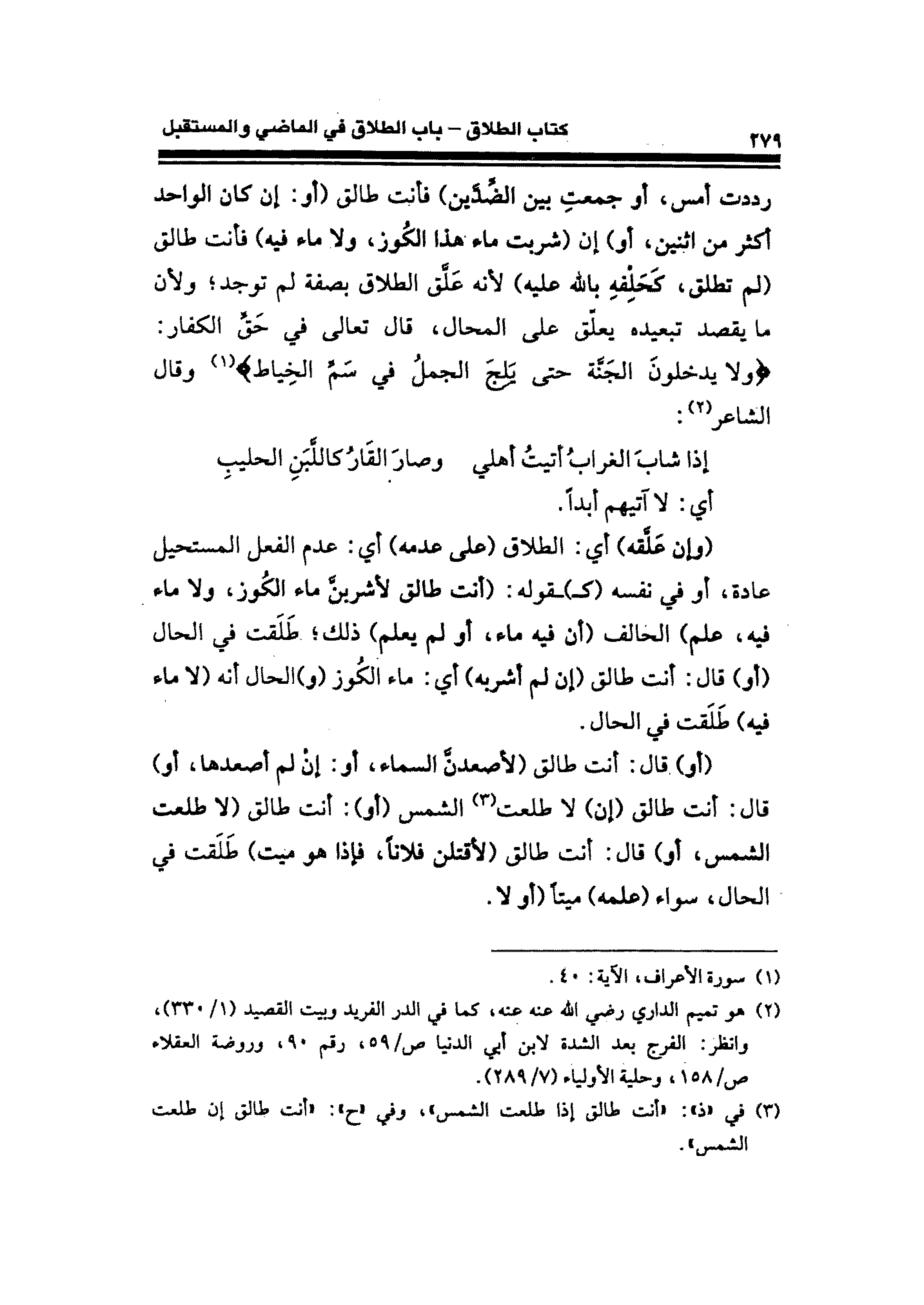 رددت أمس، أو جمعتِ بين الضِّدَّين) فأنت طالق (أو: إن كان الواحد أكثر من اثنين، أو) إن (شربت ماء هذا الكُوز، ولا ماء فيه) فأنت طالق (لم تطلق، كَحَلْفهِ بالله عليه) لأنه عَلَّق الطلاق بصفة لم توجد؛ ولأن ما يقصد تبعيده يعلّق على المحال، قال تعالى في حَقِّ الكفار: {وَلَا يَدْخُلُونَ الْجَنَّةَ حَتَّى يَلِجَ الْجَمَلُ فِي سَمِّ الْخِيَاطِ} (¬١) وقال الشاعر (¬٢):