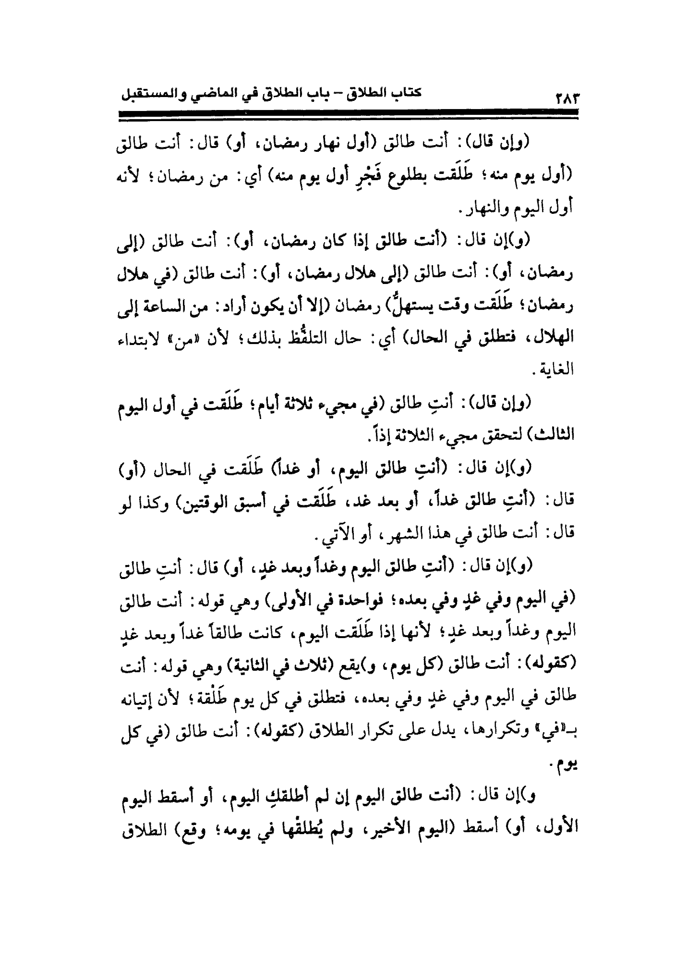 (و) إن قال: (أنتِ طالق اليوم، أو غدًا) طَلَقت في الحال (أَو) قال: (أنتِ طالق غدًا، أو بعد غد، طَلَقت في أسبق الوقتين) وكذا لو قال: أنت طالق في هذا الشهر، أو الآتي.
