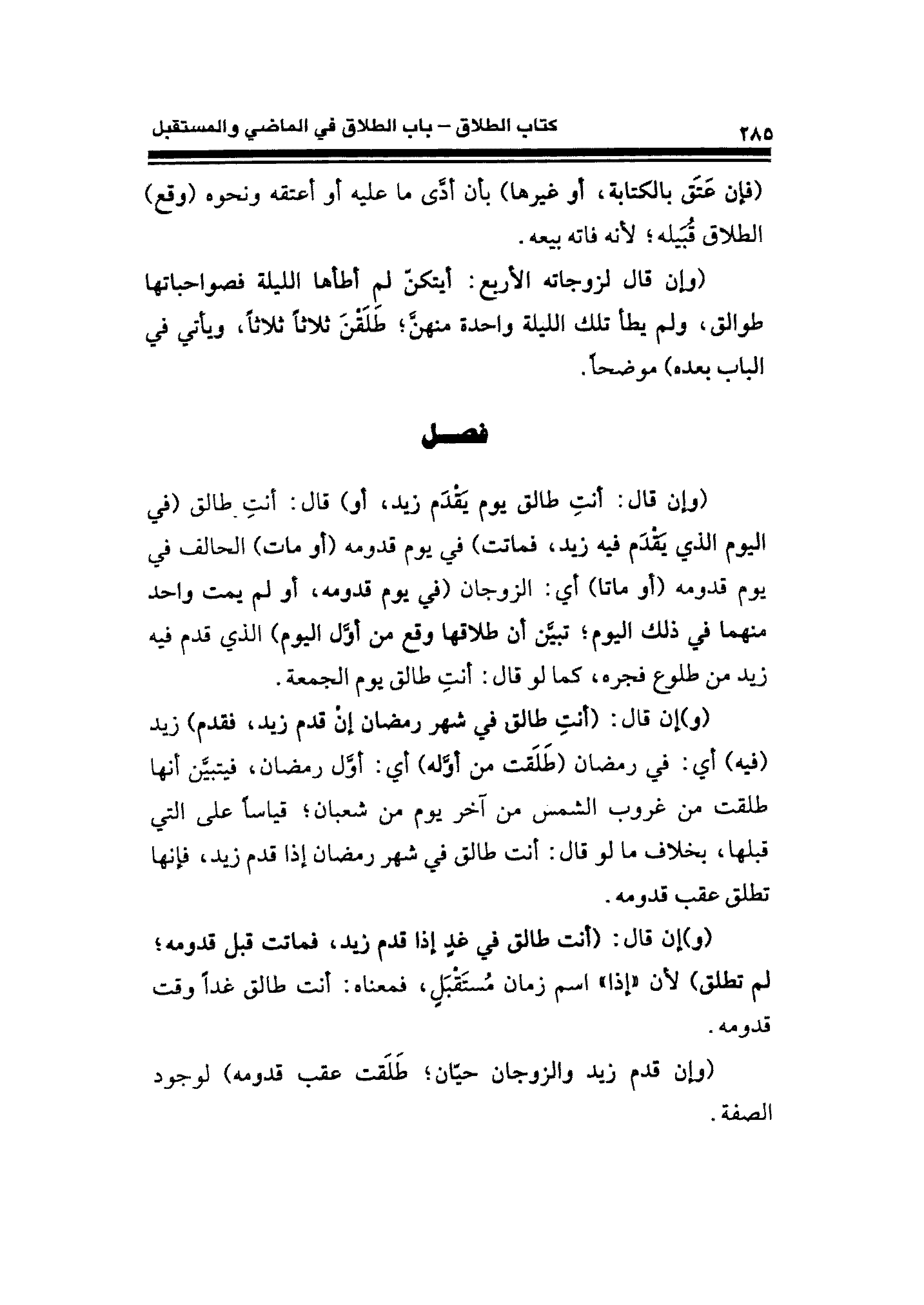 (و) إن قال: (أنتِ طالق في شهر رمضان إنْ قدم زيد، فقدم) زيد (فيه) أي: في رمضان (طَلَقت من أوَّله) أي: أوَّل رمضان، فيتبيَّن أنها طلقت من غروب الشمس من آخر يوم من شعبان؛ قياسًا على التي قبلها، بخلاف ما لو قال: أنت طالق في شهر رمضان إذا قدم زيد، فإنها تطلق عقب قدومه.