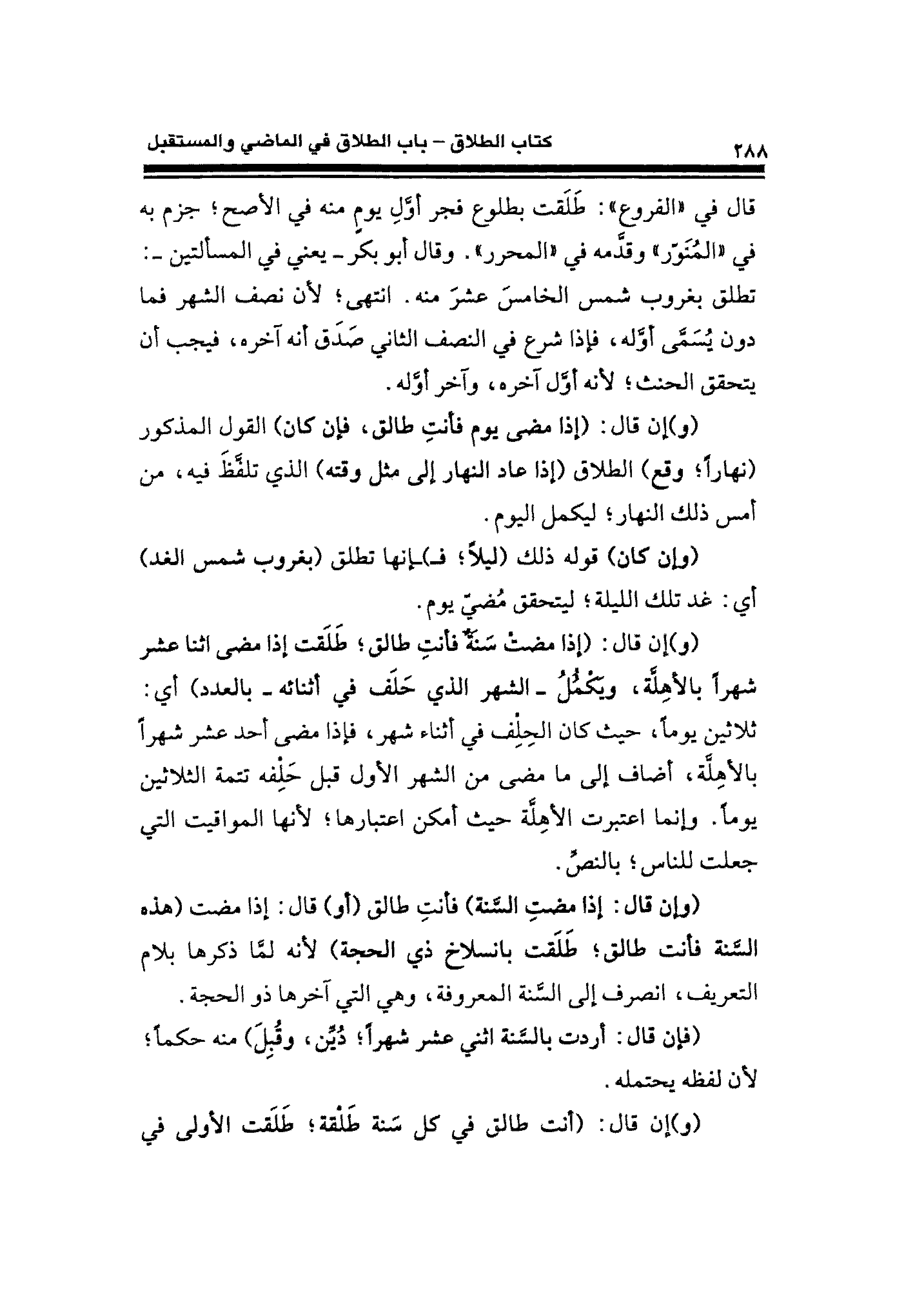 (وإن قال: إذا مضتِ السَّنة) فأنتِ طالق (أو) قال: إذا مضت (هذه السَّنة فأنت طالق؛ طَلَقت بانسلاخ ذي الحجة) لأنه لمَّا ذكرها بلام التعريف، انصرف إلى السَّنة المعروفة، وهي التي آخرها ذو الحجة.