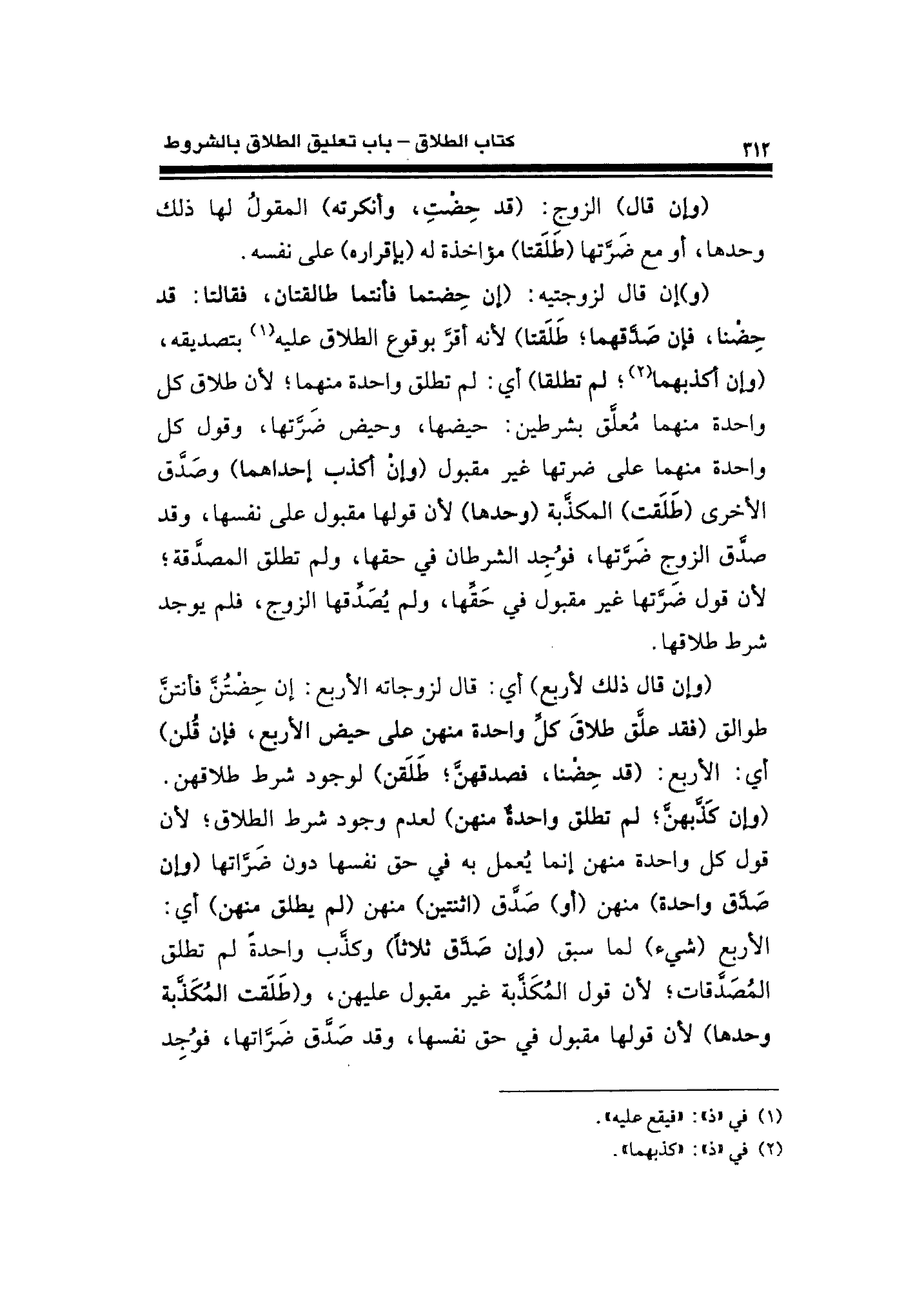 (وإن قال ذلك لأربع) أي: قال لزوجاته الأربع: إن حِضتُنَّ فأنتنَّ طوالق (فقد علَّق طلاقَ كلِّ واحدة منهن على حيض الأربع، فإن قُلن) أي: الأربع: (قد حِضْنا، فصدقهنَّ؛ طَلَقن) لوجود شرط طلاقهن. (وإن كَذَّبهنَّ؛ لم تطلق واحدةٌ منهن) لعدم وجود شرط الطلاق؛ لأن قول كل واحدة منهن إنما يُعمل به في حق نفسها دون ضَرَّاتها (وإن صَدَّق واحدة) منهن (أو) صَدَّق (اثنتين) منهن (لم يطلق منهن) أي: الأربع (شيء) لما سبق (وإن صَدَّق ثلاثًا) وكذب واحدةً لم تطلق المُصَدَّقات؛ لأن قول المُكَذَّبة غير مقبول عليهن، و (طَلَقت المُكَذَّبة وحدها) لأن قولها مقبول في حق نفسها، وقد صَدَّق ضَرَّاتها، فوُجِد