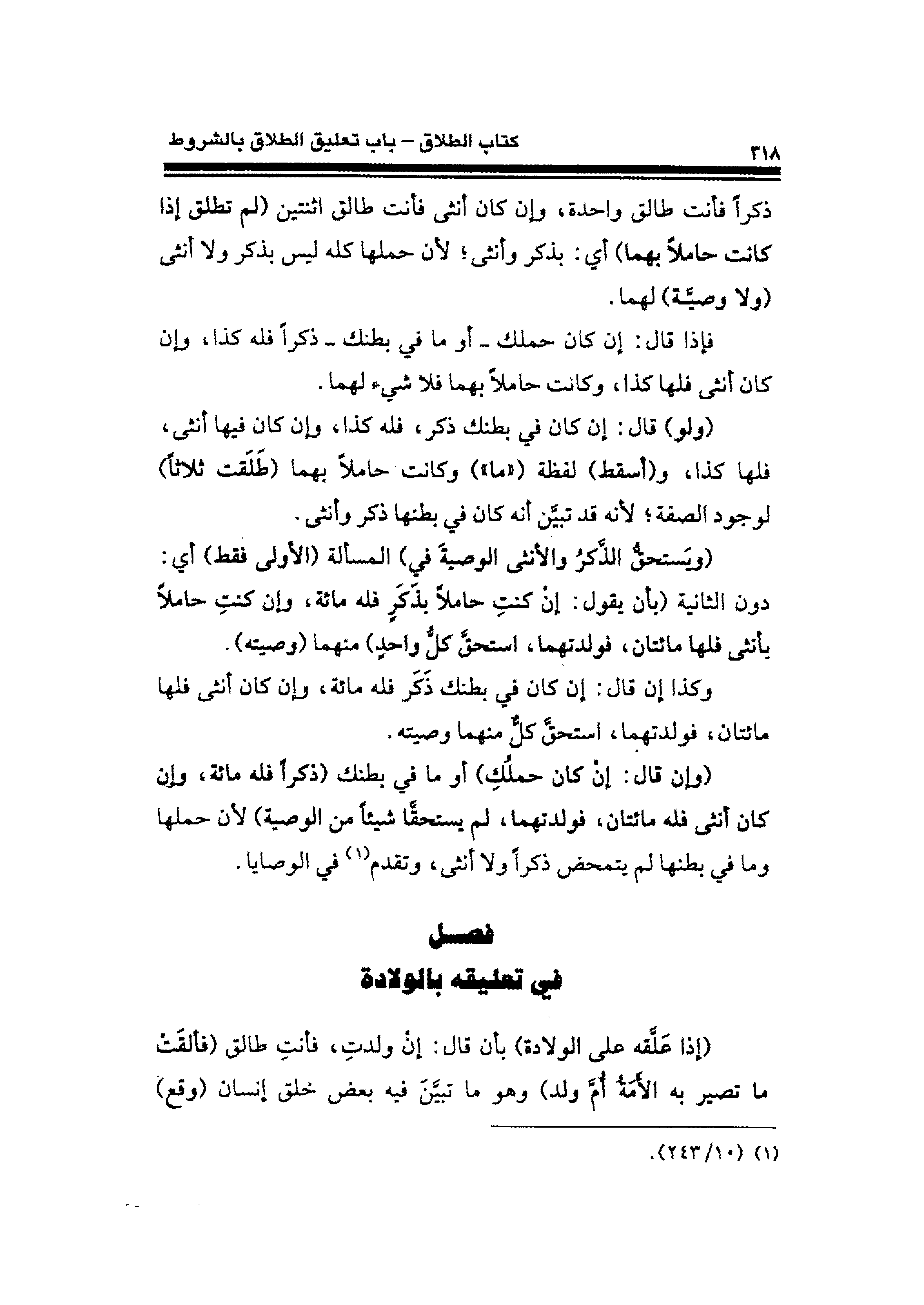 (ولو) قال: إن كان في بطنك ذكر، فله كذا، وإن كان فيها أنثى، فلها كذا، و (أسقط) لفظة ("ما") وكانت حاملًا بهما (طَلَقت ثلاثًا) لوجود الصفة؛ لأنه قد تبيَّن أنَّه كان في بطنها ذكر وأنثى.