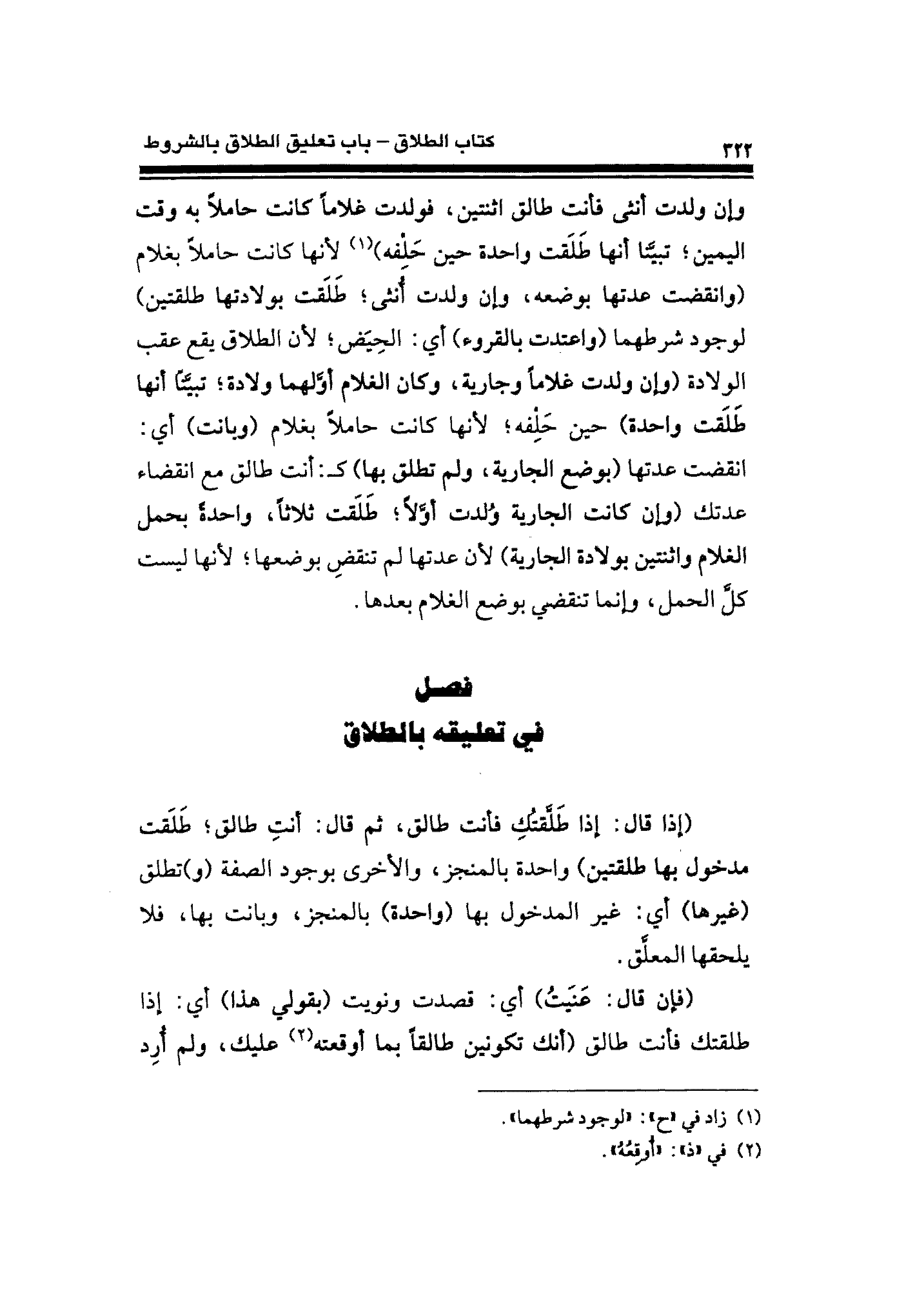 وإن ولدت أنثى فأنت طالق اثنتين، فولدت غلامًا كانت حاملًا به وقت اليمين؛ تبيَّنا أنها طَلَقت واحدة حين حَلِفْه) (¬١) لأنها كانت حاملًا بغلام (وانقضت عدتها بوضعه، وإن ولدت أُنثى؛ طَلَقت بولادتها طلقتين) لوجود شرطهما (واعتدت بالقروء) أي: الحِيَض؛ لأن الطلاق يقع عقب الولادة (وإن ولدت غلامًا وجارية، وكان الغلام أوَّلهما ولادة؛ تبيَّنَا أنها طَلَقت واحدة) حين حَلِفْه؛ لأنها كانت حاملًا بغلام (وبانت) أي: انقضت عدتها (بوضع الجارية، ولم تطلق بها) كـ: أَنْتَ طالق مع انقضاء عدتك (وإن كانت الجارية وُلدت أوَّلًا؛ طَلَقت ثلاثًا، واحدةً يحمل الغلام واثنتين بولادة الجارية) لأن عدتها لم تنقضِ بوضعها؛ لأنها ليست كلَّ الحمل، وإنما تنقضي بوضع الغلام بعدها.