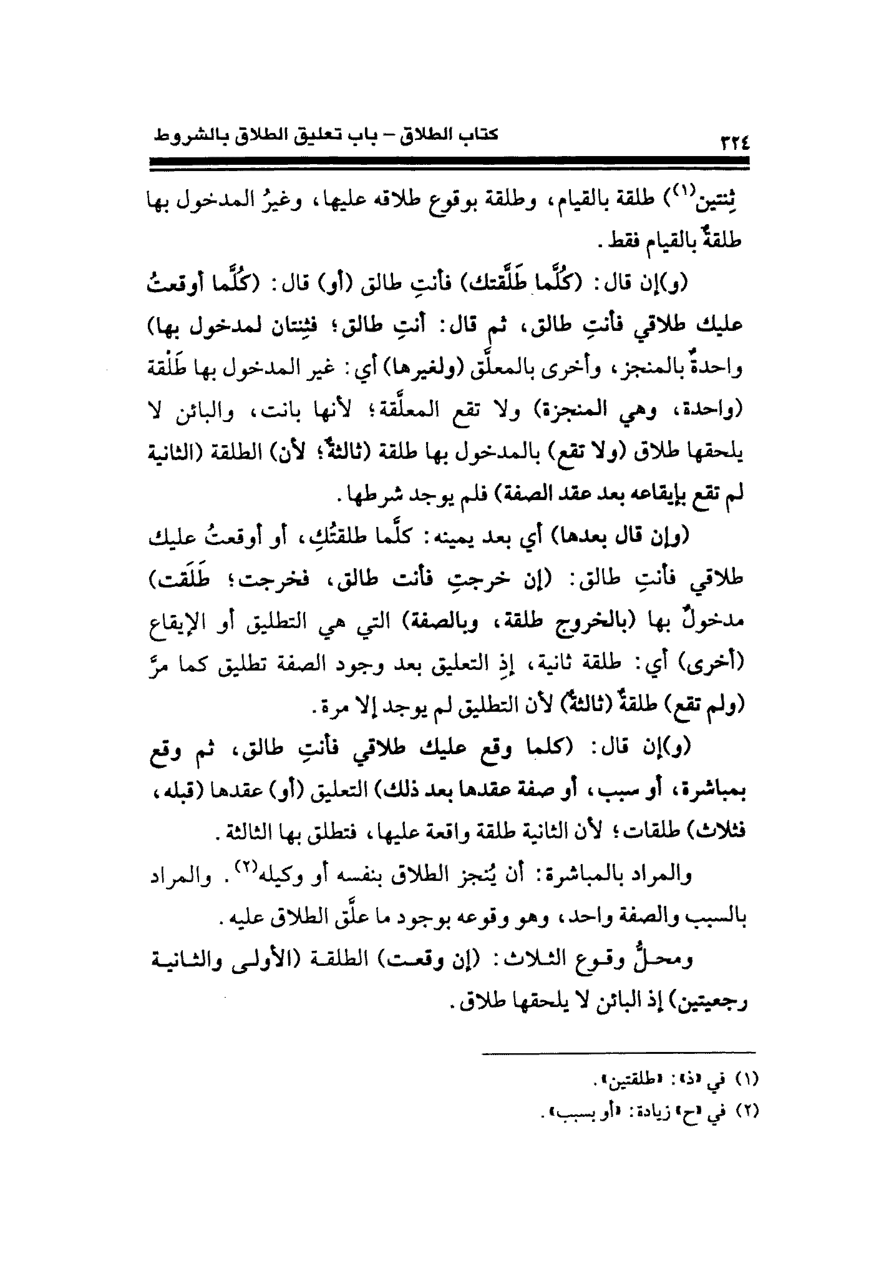 والمراد بالمباشرة: أن يُنجز الطلاق بنفسه أو وكيله (¬٢). والمراد بالسبب والصفة واحد، وهو وقوعه بوجود ما علَّق الطلاق عليه.