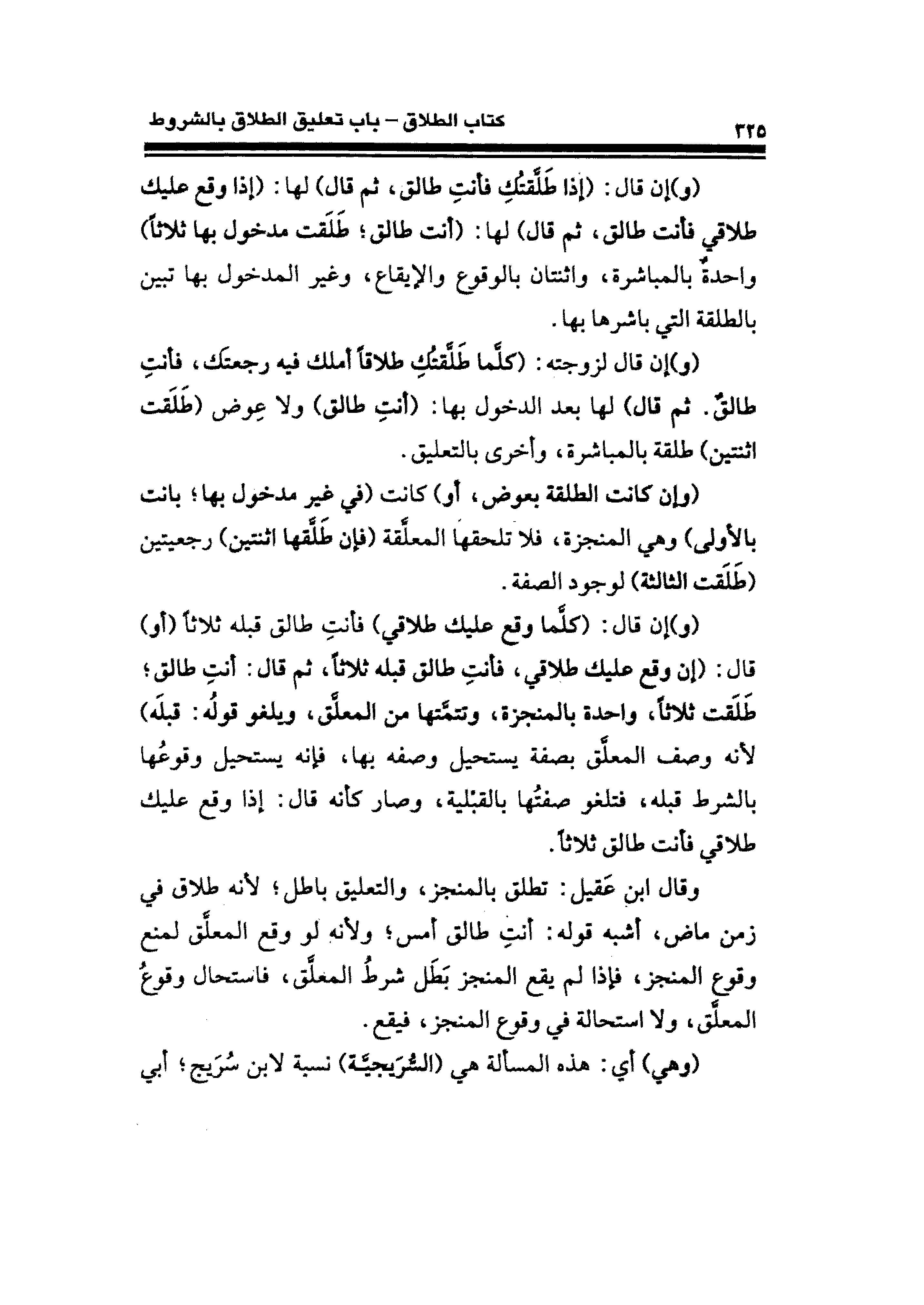 (و) إن قال لزوجته: (كلَّما طَلَّقتُكِ طلاقًا أملك في رجعتَك، فأنتِ طالقٌ. ثم قال) لها بعد الدخول بها: (أنتِ طالق) ولا عِوض (طَلَقت اثنتين) طلقة بالمباشرة، وأخرى بالتعليق.