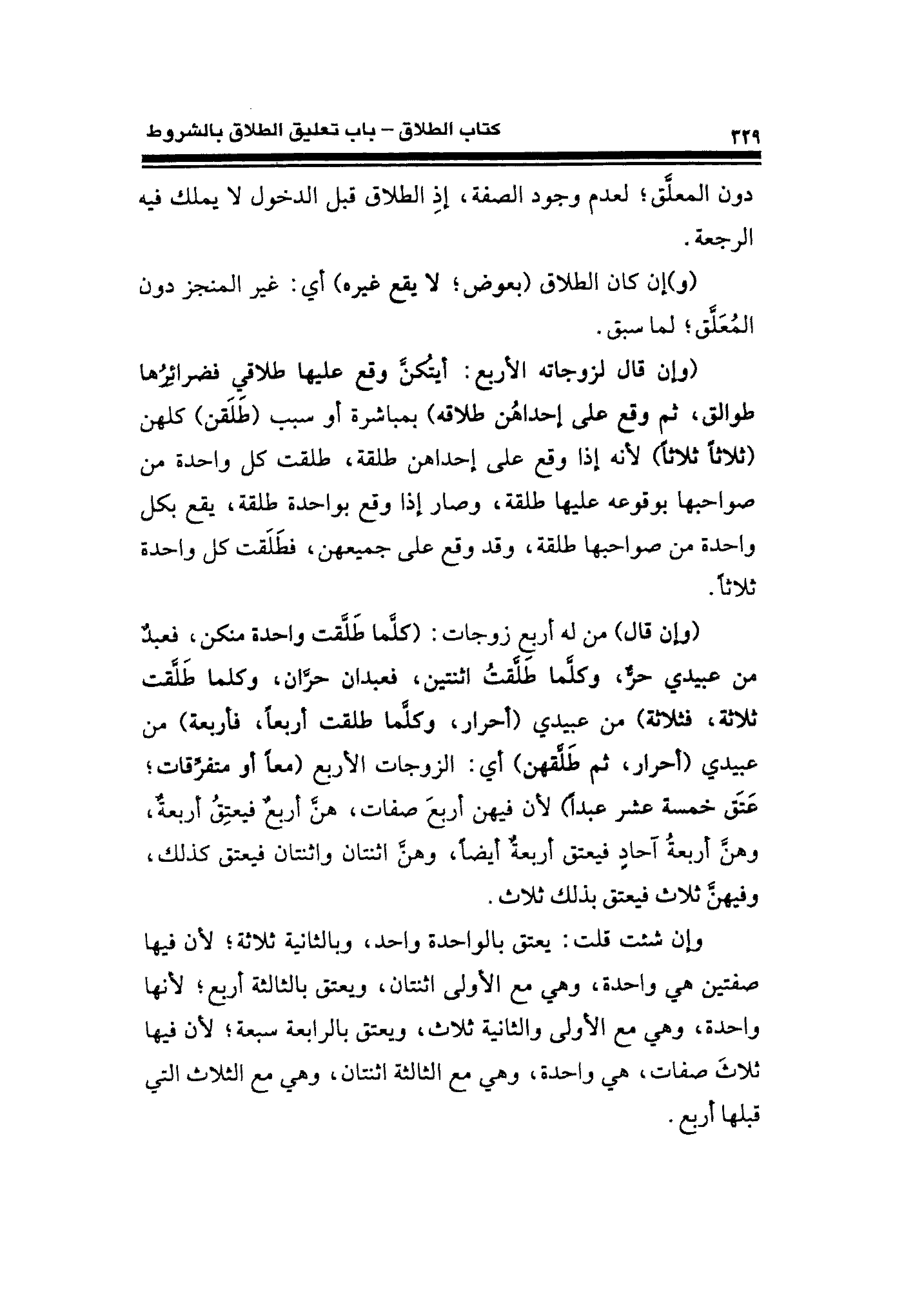 (وإن قال) من له أربِع زوجات: (كلَّما طَلَّقت واحدة منكن، فعبدٌ من عبيدي حرٌّ، وكلَّما طَلَّقتُ أثنتين، فعبدان حرَّان، وكلما طَلَّقت ثلاثة، فثلاثة) من عبيدي (أحرار، وكلَّما طلقت أربعًا، فأربعة) عن عبيدي (أحرار، ثم طَلَّقهن) أي: الزوجات الأربع (معًا أو متفرِّقات؛ عَتَق خمسة عشر عبدًا) لأن فيهن أربعَ صفات، هنَّ أربعٌ فيعتِقُ أربعةٌ، وهنَّ أربعةُ آحادٍ فيعتق أربعةٌ أيضًا، وهنَّ ائنتان واثنتان فيعتق كذلك، وفيهنَّ ثلاث فيعتق بذلك ثلاث.