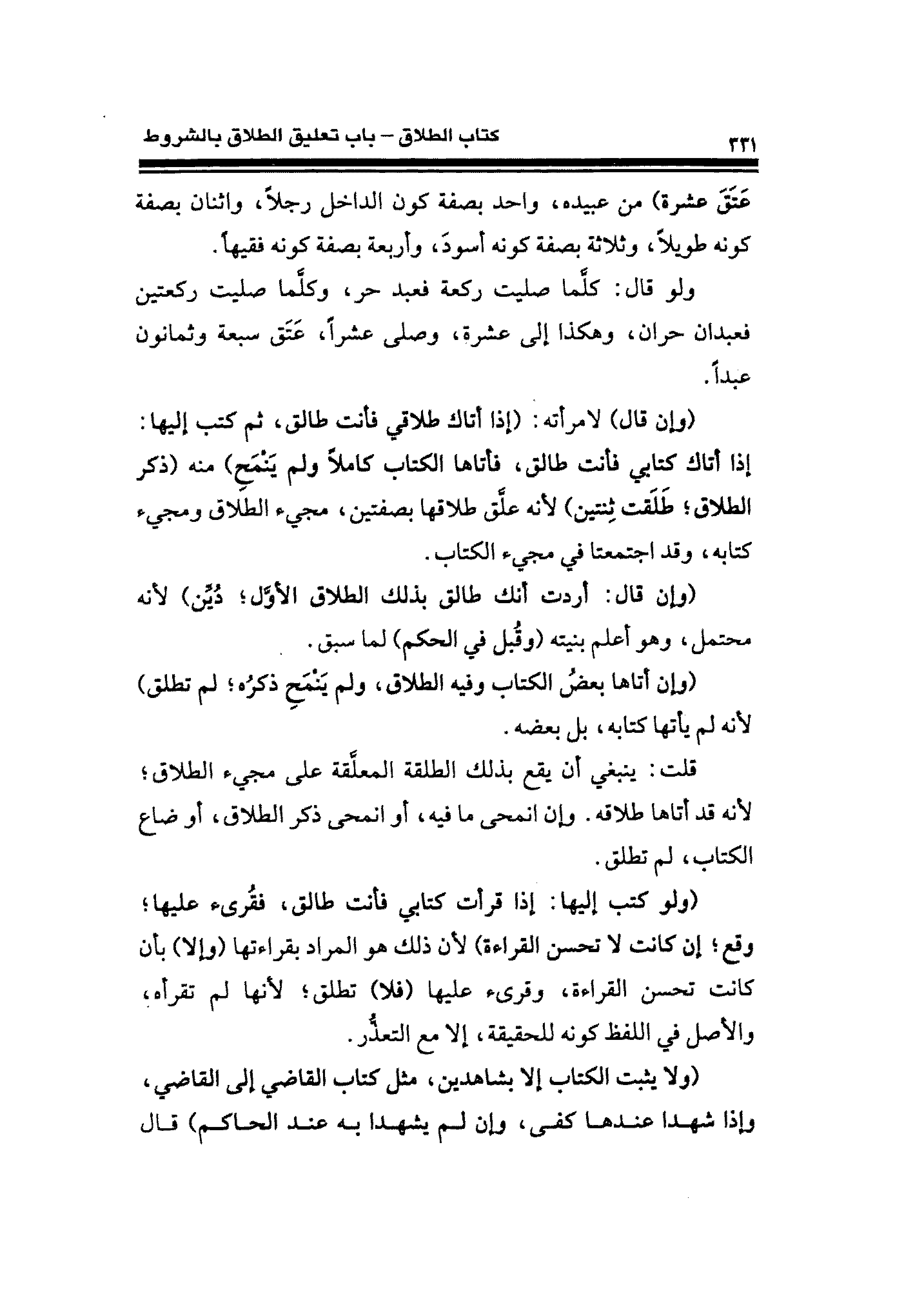 قلت: ينبغي أن يقع بذلك الطلقة المعلَّقة على مجيء الطلاق؛ لأنه قد أتاها طلاقه. وإن انمحى ما فيه، أو انمحى ذكر الطلاق، أو ضاع الكتاب، لم تطلق.
