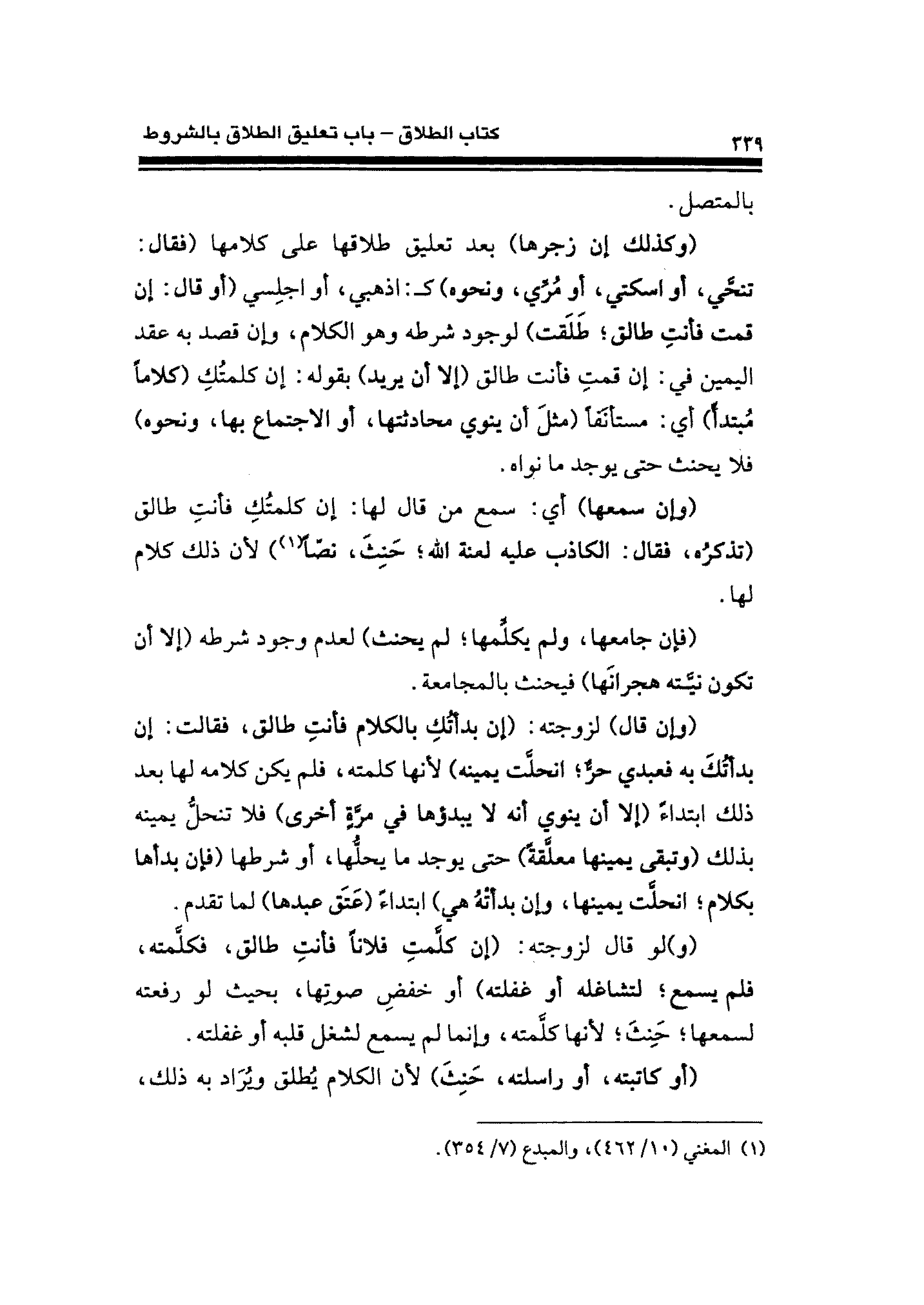 (وكذلك إن زجرها) بعد تعليق طلاقها على كلامها (فقال: تنحِّي، أو اسكتي، أو مُرِّي، ونحوه) كـ: اذهبي، أو اجلِسي (أو قال: إن قمت فأنتِ طالق؛ طَلَقت) لوجود شرطه وهو الكلام، وإن قصد به عقد اليمين في: إن قمتِ فأنت طالق (إلا أن يريد) بقوله: إن كلمتُكِ (كلامًا مُبتدأ) أي: مستأنَفًا (مثل أن ينوي محادثتها، أو الاجتماع بها، ونحوه) فلا يحنث حتى يوجد ما نراه.
