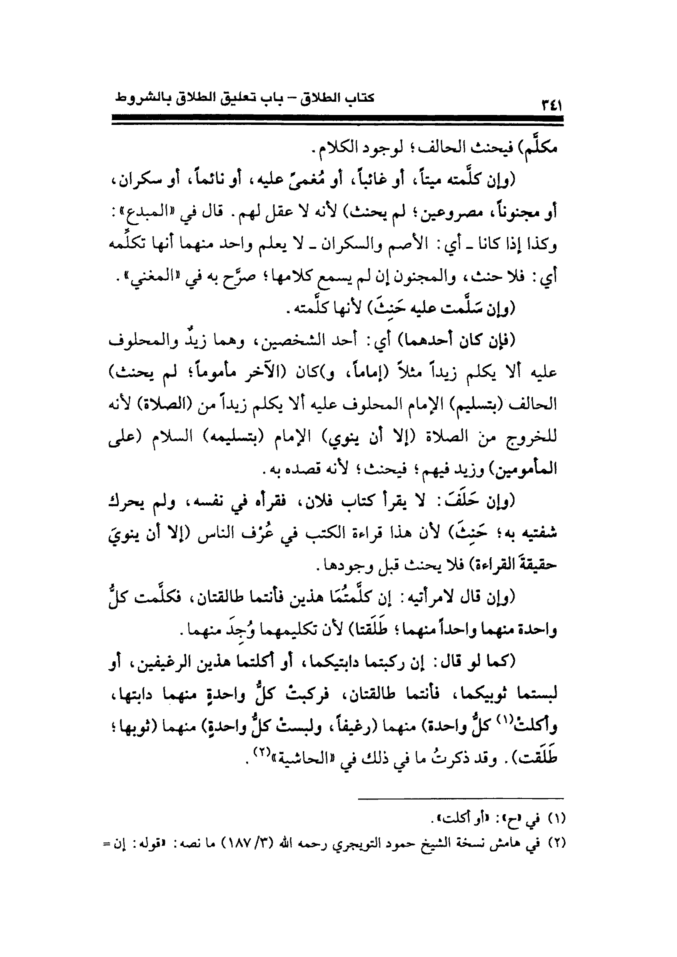 (وإن كلَّمته ميتًا، أو غائبًا، أو مُغمى عليه، أو نائمًا، أو سكران، أو مجنونًا، مصروعين؛ لم بحنث) لأنه لا عقل لهم. قال في "المبدع": وكذا إذا كانا -أي: الأصم والسكران- لا يعلم واحد عنهما أنها تكلِّمه أي: فلا حنث، والمجنون أن لم يسمع كلامها؛ صرَّح به في "المغني".
