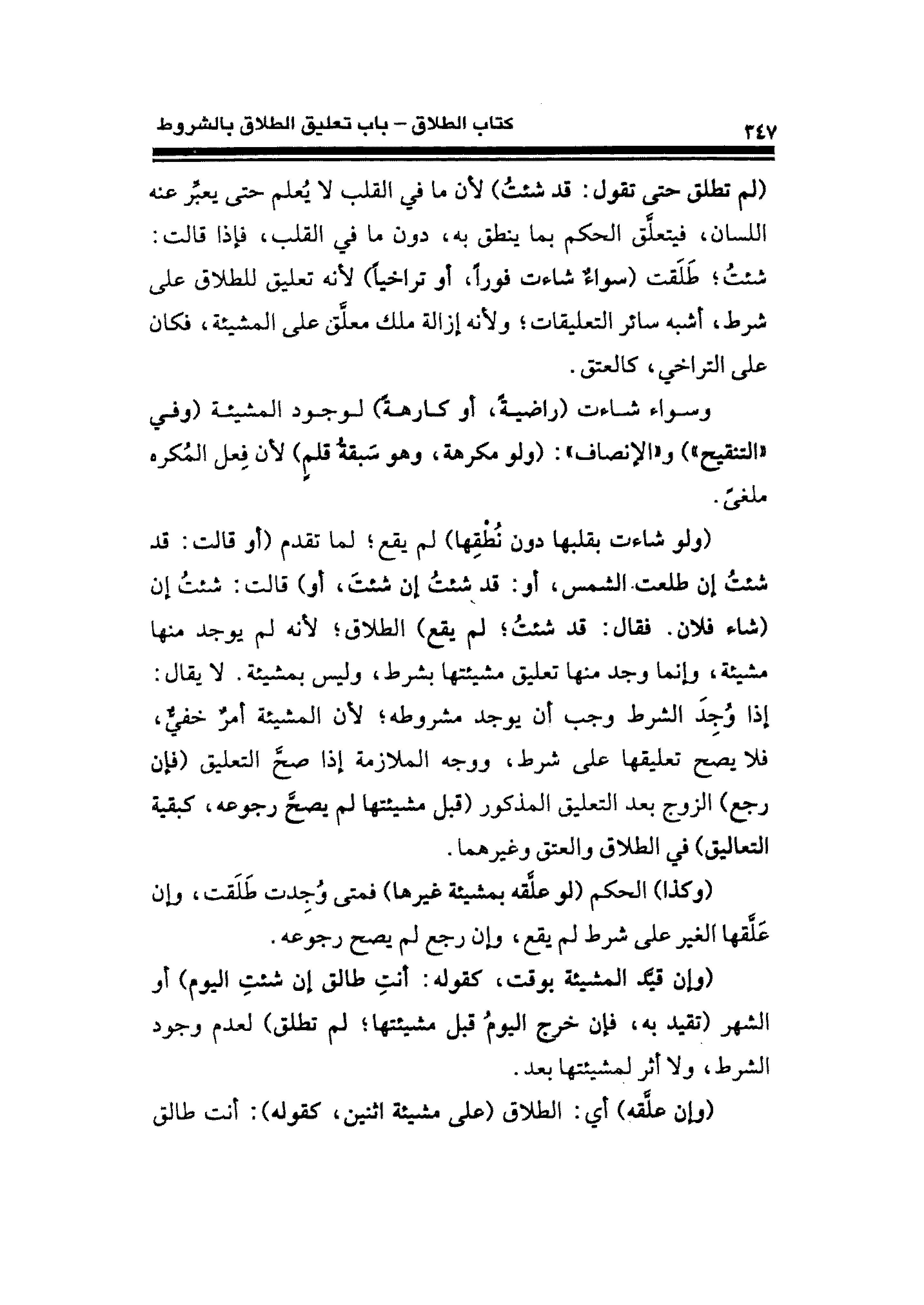 (ولو شاءت بقلبها دون نُطْقِها) لم يقع؛ لما تقدم (أو قالت: قد شئتُ إن طلعت الشمس، أو: قد شئتُ؛ إن شئتَ، أو) قالت: شئتُ إن (شاء فلان. فقال: قد شئتُ؛ لم يقع) الطلاق؛ لأنه لم يوجد منها مشيئة، وإنما وجد منها تعليق مشيئتها بشرط، وليس بمشيئة. لا يقال: إذا وُجِدَ الشرط وجب إن يوجد مشروطه؛ لأن المشيئة أمرٌ خفيٌّ، فلا يصح تعليقها على شرط، ووجه الملازمة إذا صحَّ التعليق (فإن رجع) الزوج بعد التعليق المذكور (قبل مشيئتها لم يصحَّ رجوعه، كبقية التعاليق) في الطلاق والعتق وغيرهما.