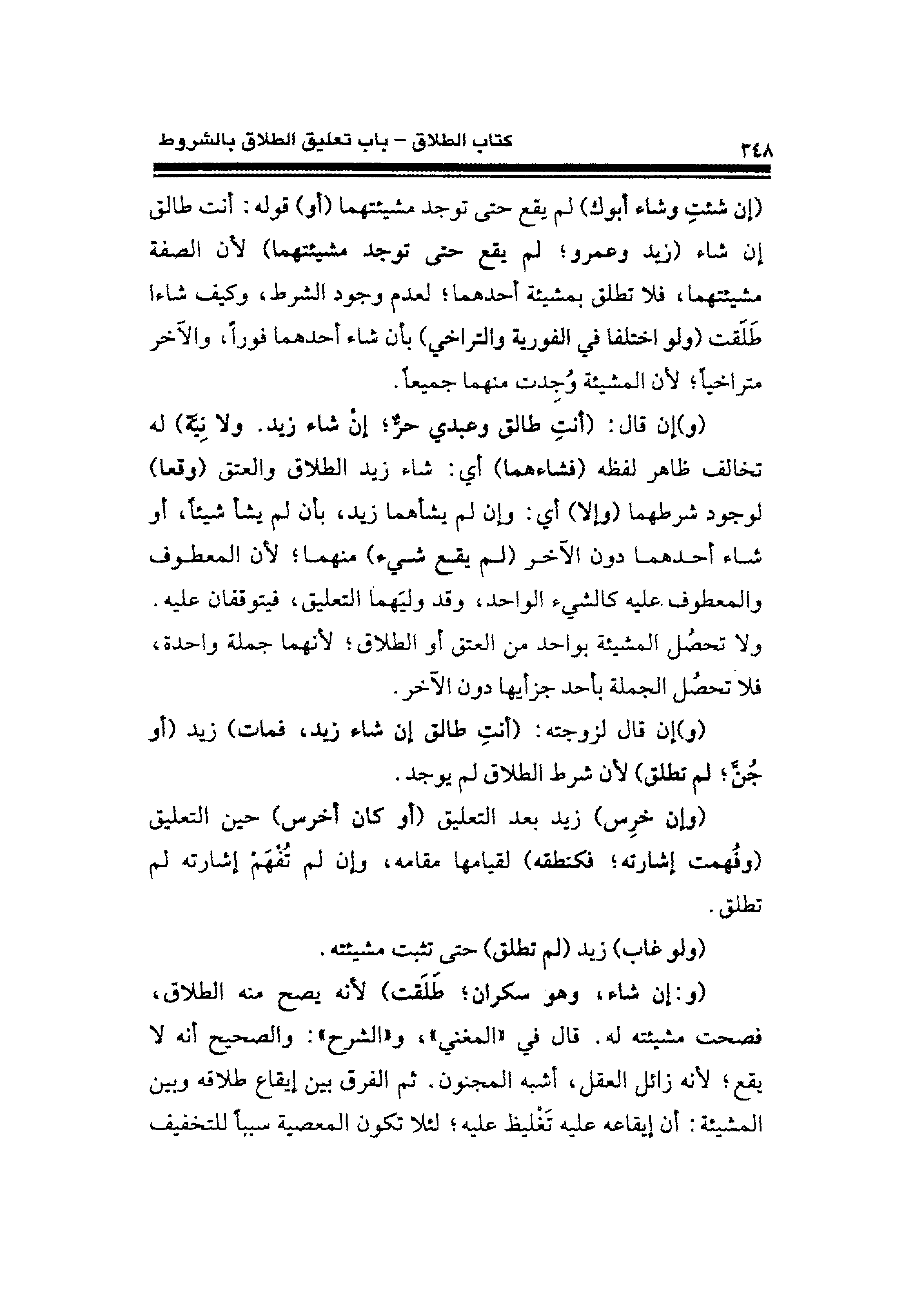 (إن شئتِ وشاء أبوك) لم يقع حتى توجد مشيئتهما (أو) قوله: أنت طالق إن شاء (زيد وعمرو؛ لم يقع حتى توجد مشيئتهما) لأن الصفة مشيئتهما، فلا تطلق بمشيئة أحدهما؛ لعدم وجود الشرط، وكيف شاءا طَلَقت (ولو اختلفا في الفوريه والتراخي) بأن شاء أحدهما فورًا، والآخر متراخيًا؛ لأن المشيئة وُجِدت منهما جميعًا.