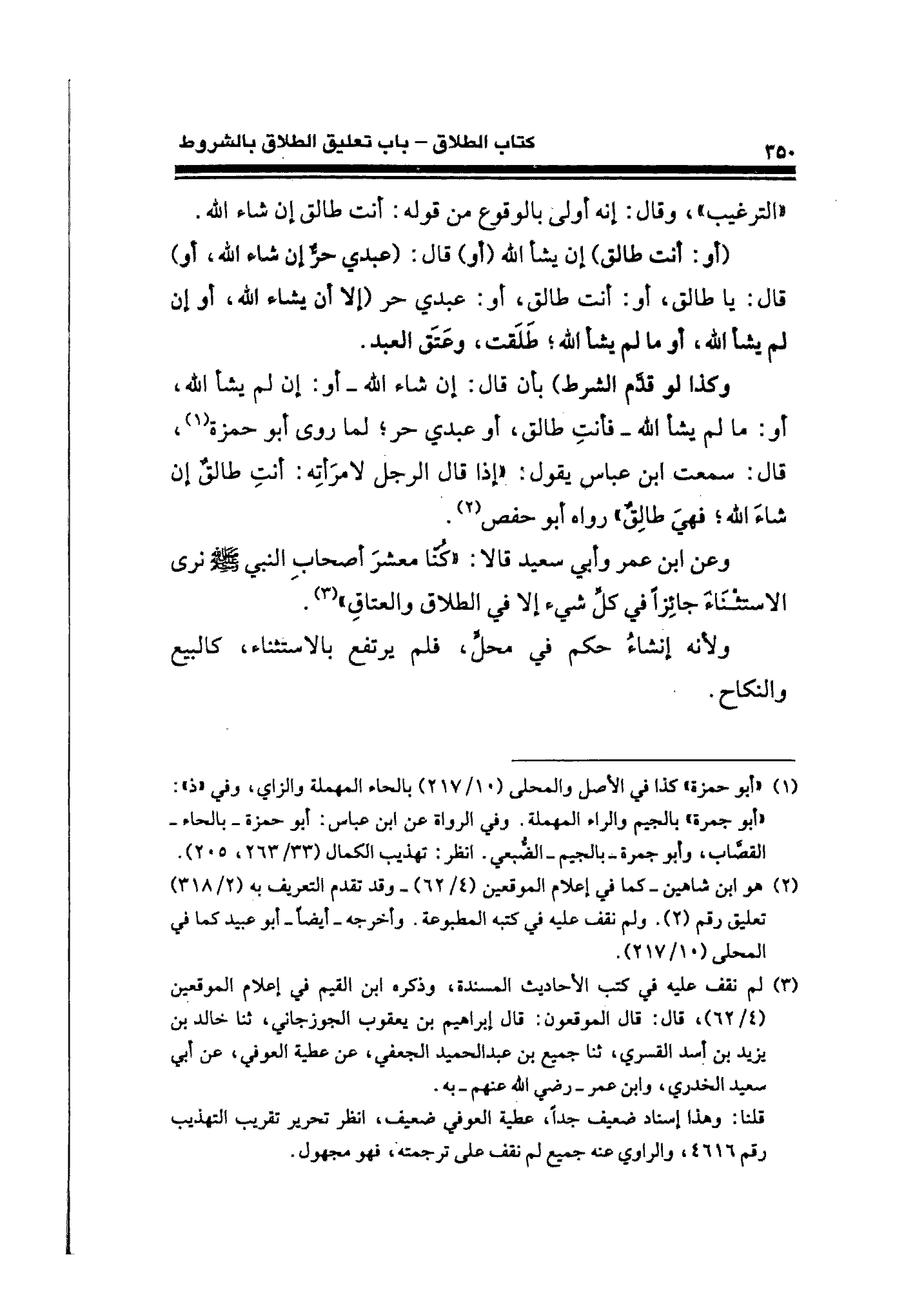 وكذا لو قدَّم الشرط) بأن قال: إن شاء الله -أو: إن لم يشأ الله، أو: ما لم يشأ الله- فأنتِ طالق، أو عبدي حر؛ لما روى أبو حمزة (¬١)، قال: سمعت ابن عباس يقول: "إذا قال الرجل لامرأتِه: أنتِ طالقٌ إن شاءَ الله؛ فهيَ طالِقٌ" رواه أبو حفص (¬٢).